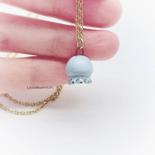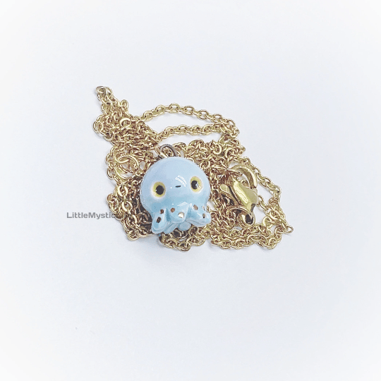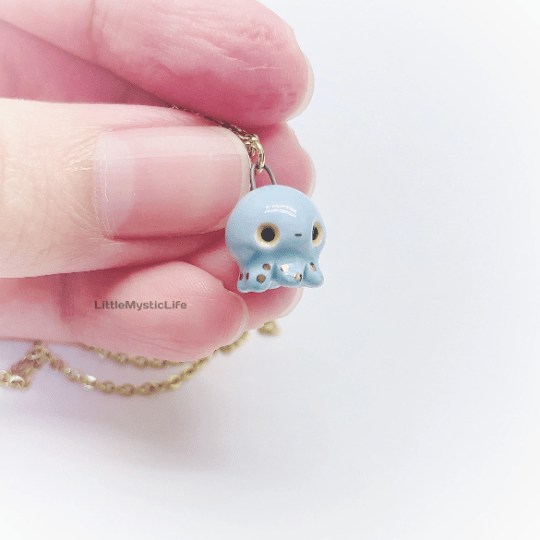 _Baby blue octopus ceramic necklace is made of low fire earthen clay and Duncan underglaze for ceramic. In order to achieve the final looking pieces, I put a lot of time and care into sculpting, glazing, and firing my pieces at the right temperature. Delicate 22k gold details are painted by hand in these pieces for elegant and shiny looking. All my pieces are very small (about as big as your thumb), please handle them with care and I recommend to take off your necklace while sleeping and showering.
