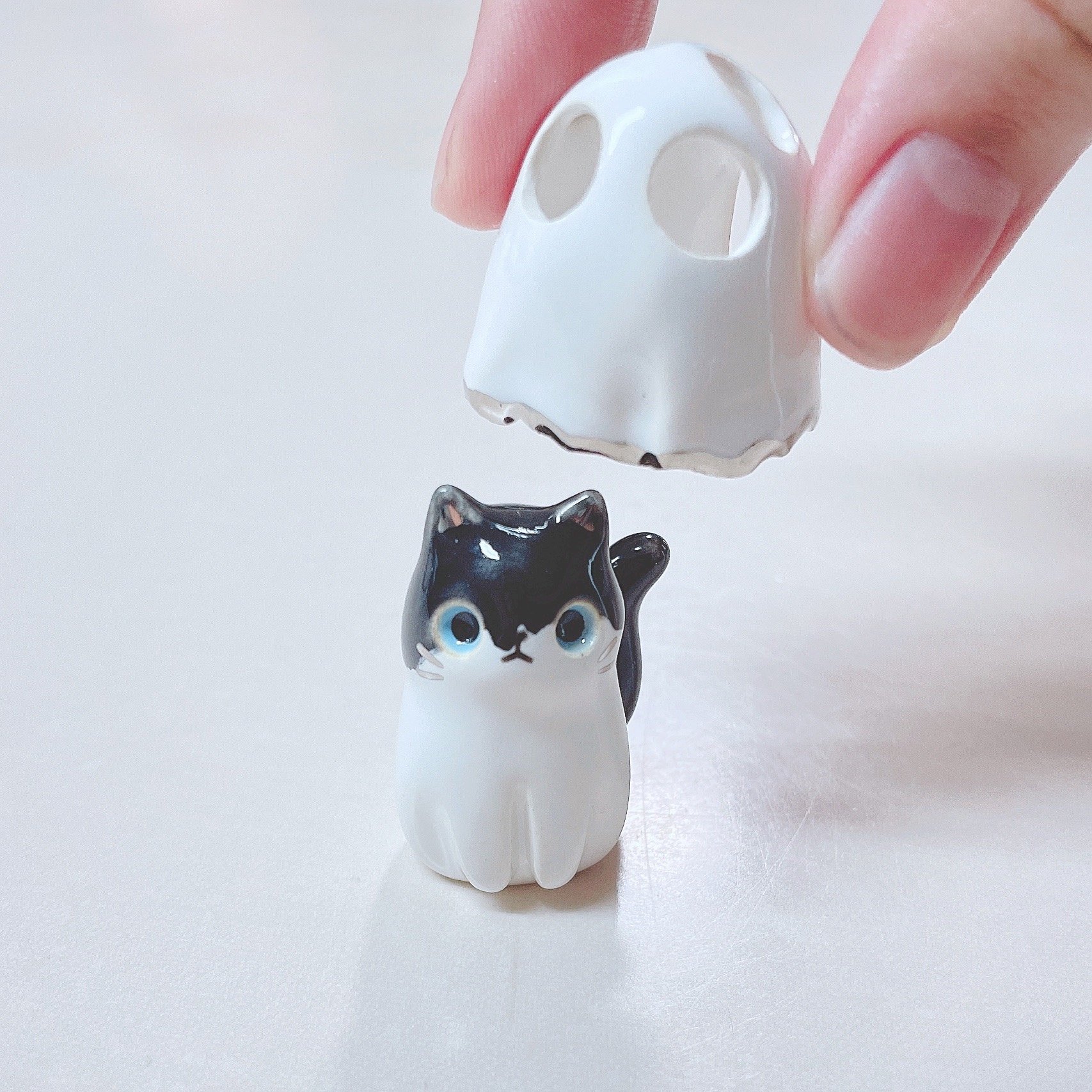 Black And White Cat With Ghost Mask Ceramic Figurine 4 (white gold version)
