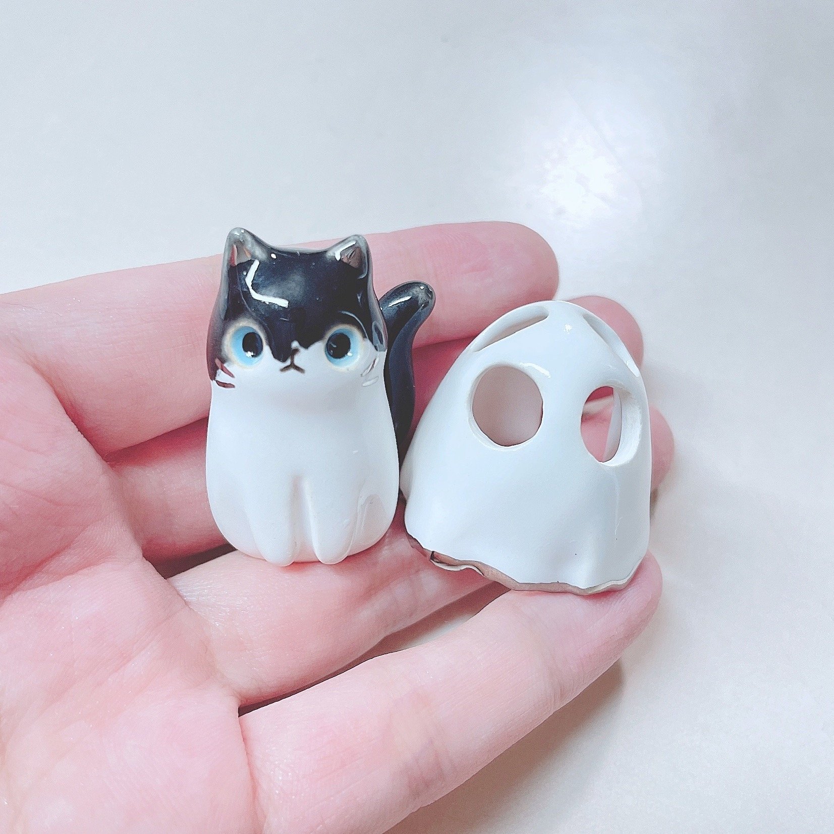 Black and white cat with ghost mask ceramic figurine is made of low fire earthen clay and Duncan underglaze for ceramic. In order to achieve the final looking pieces, I put a lot of time and care into sculpting, glazing, and firing my pieces at the right temperature. Delicate 22k white gold details are painted by hand in these pieces for elegant and shiny looking. Please handle them with care.