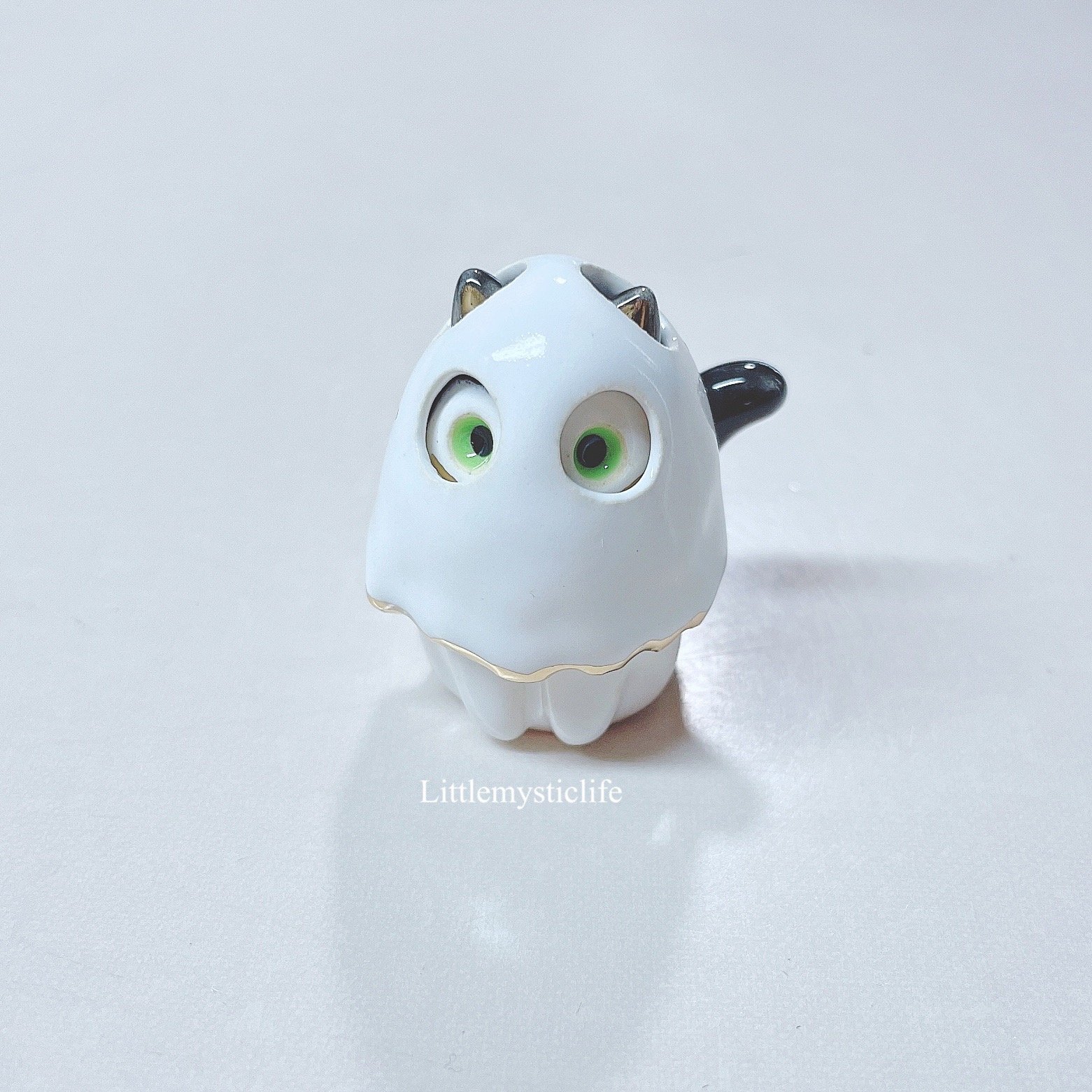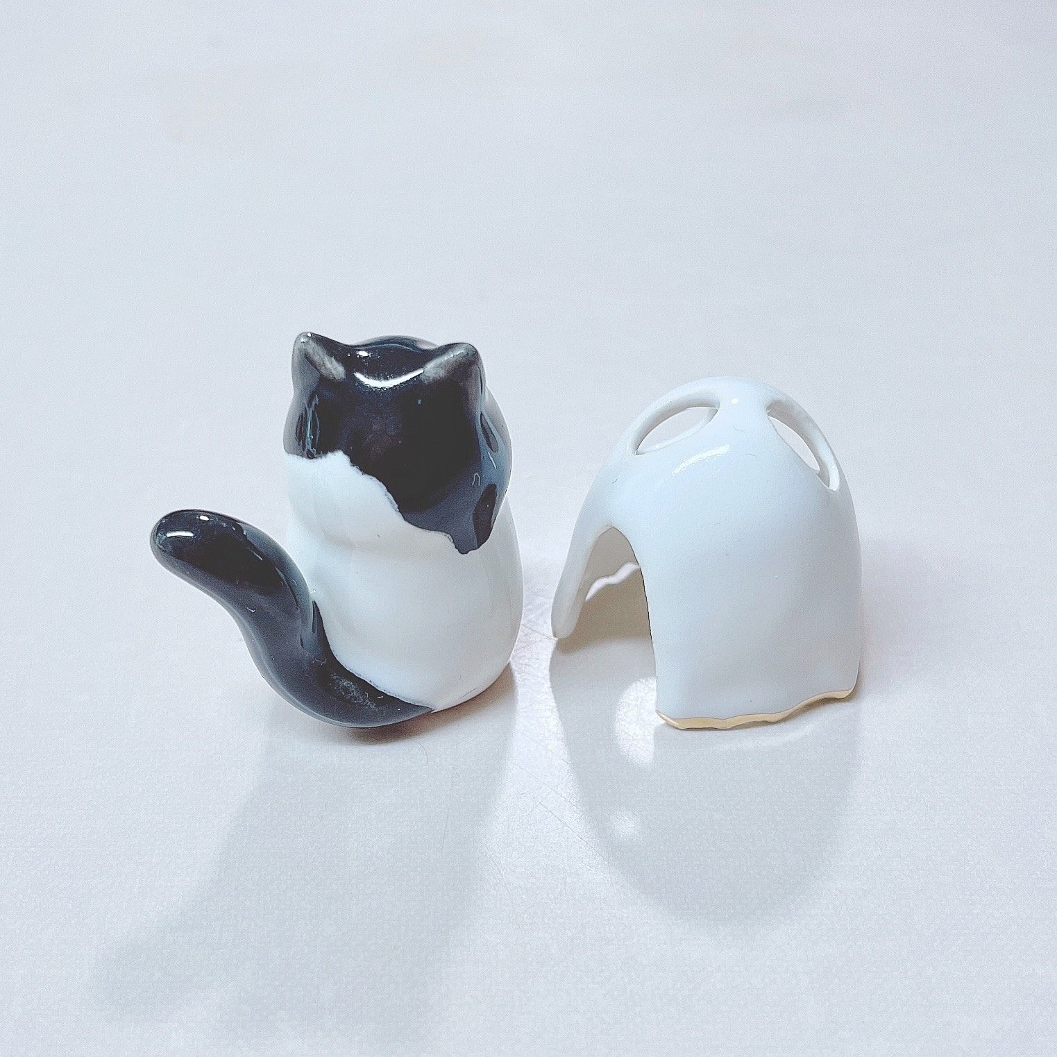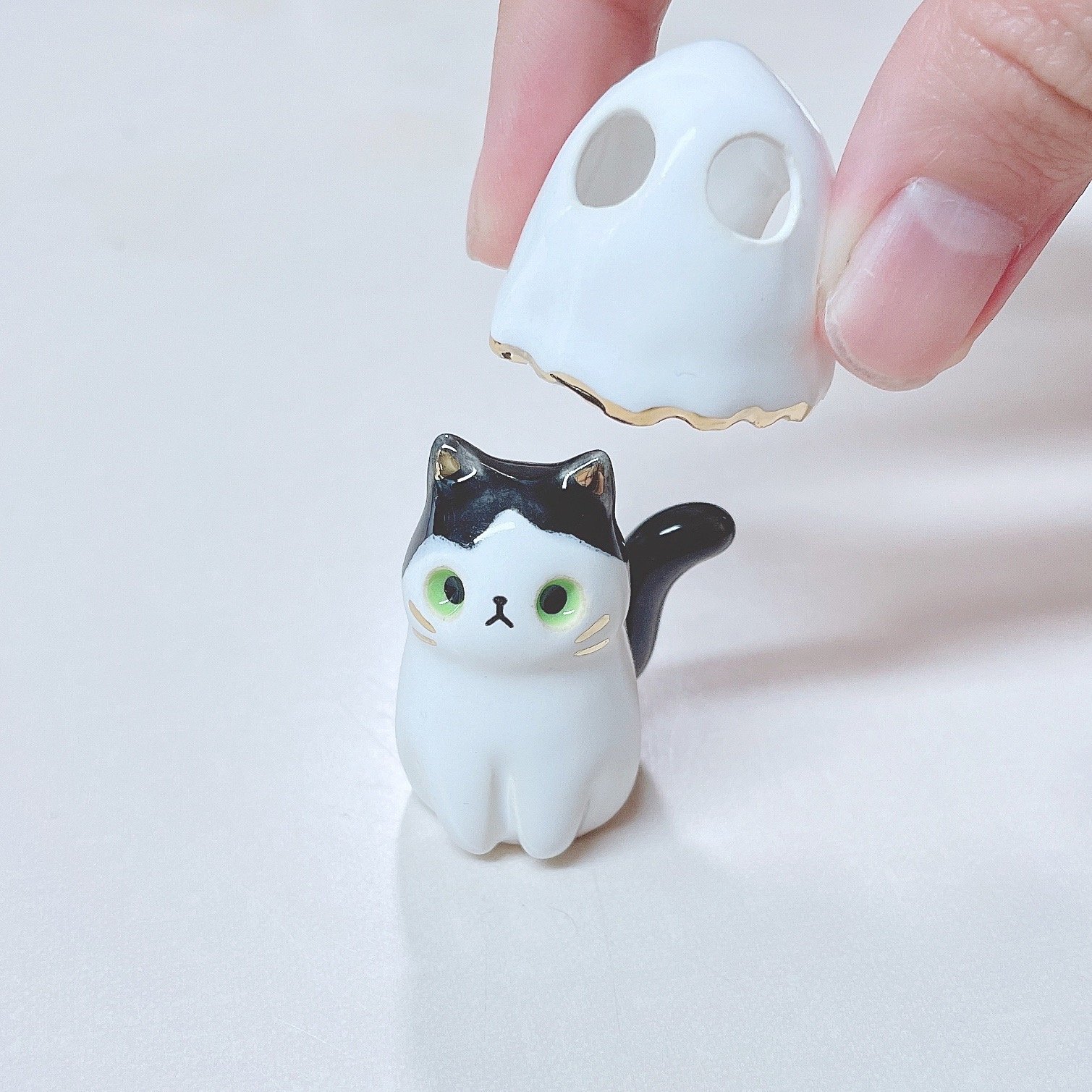 Black and white cat with ghost mask ceramic figurine is made of low fire earthen clay and Duncan underglaze for ceramic. In order to achieve the final looking pieces, I put a lot of time and care into sculpting, glazing, and firing my pieces at the right temperature. Delicate 22k gold details are painted by hand in these pieces for elegant and shiny looking. Please handle them with care.