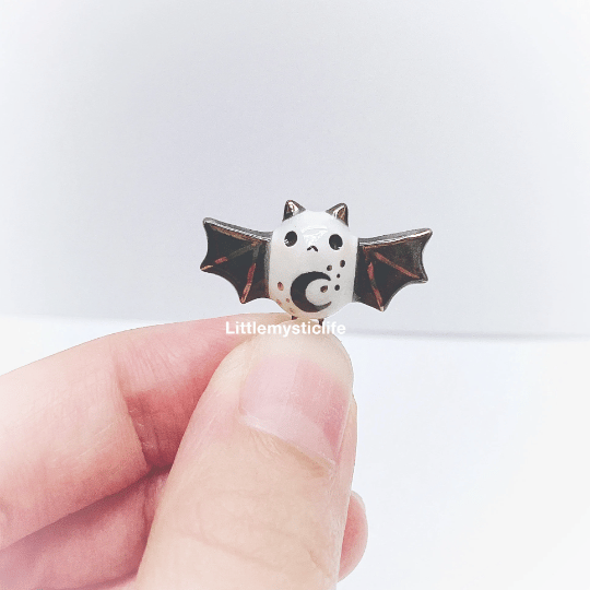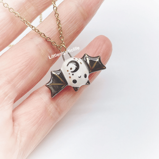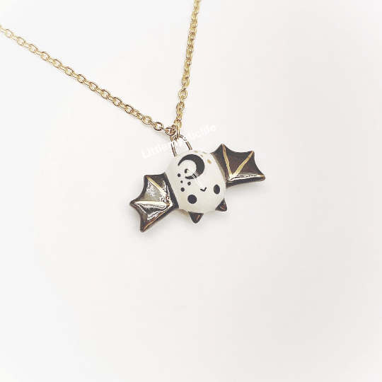 _Black bat ceramic necklace is made of low fire earthen clay and Duncan underglaze for ceramic. In order to achieve the final looking pieces, I put a lot of time and care into sculpting, glazing, and firing my pieces at the right temperature. Delicate 22k gold details are painted by hand in these pieces for elegant and shiny looking. All my pieces are very small (about as big as your thumb), please handle them with care and I recommend to take off your necklace while sleeping and showering.