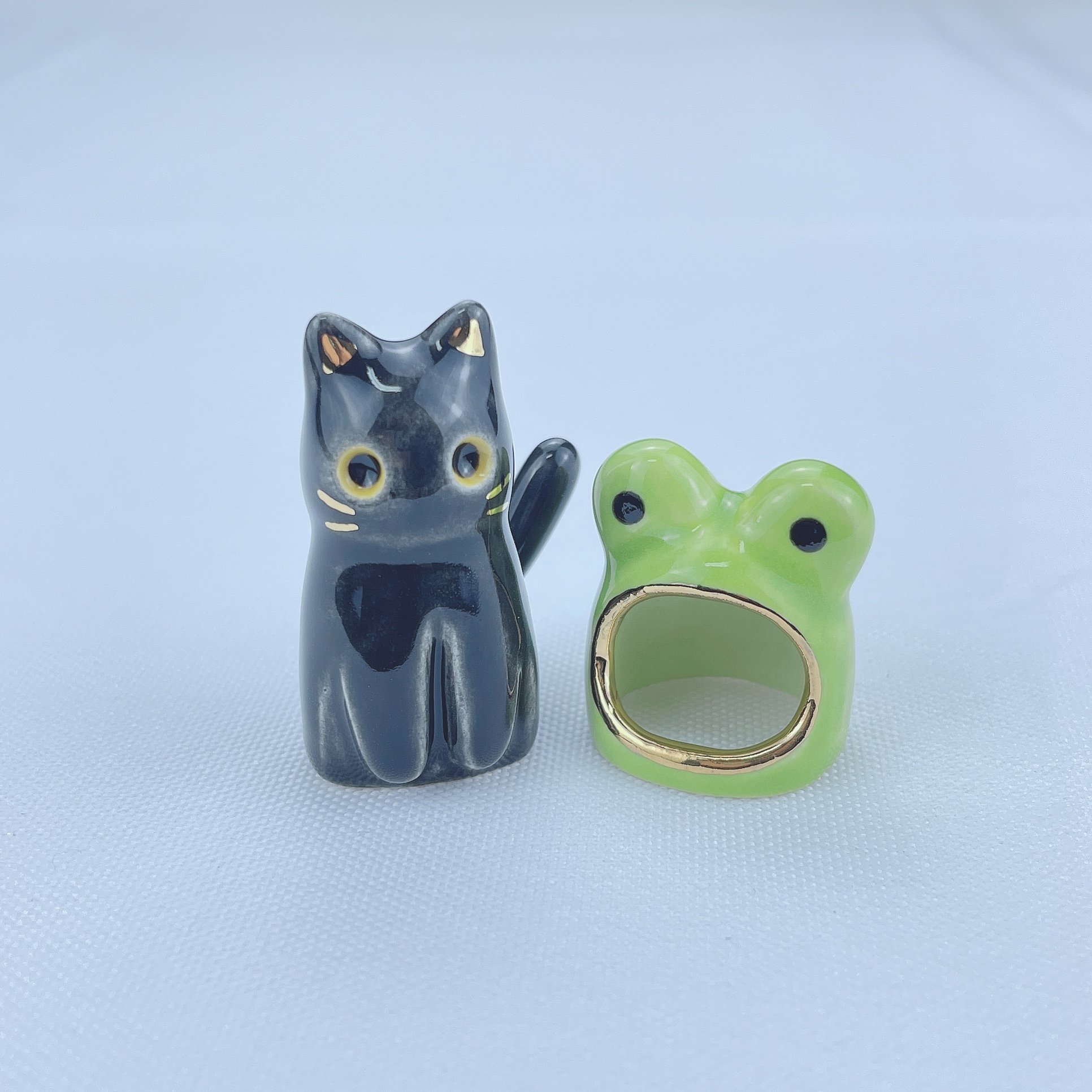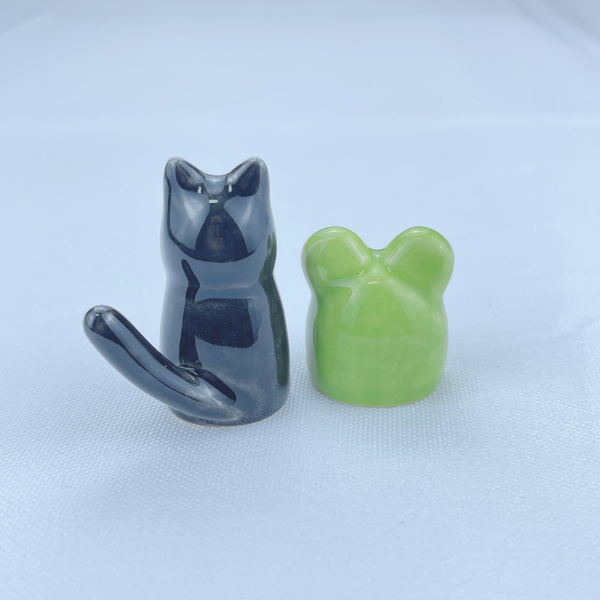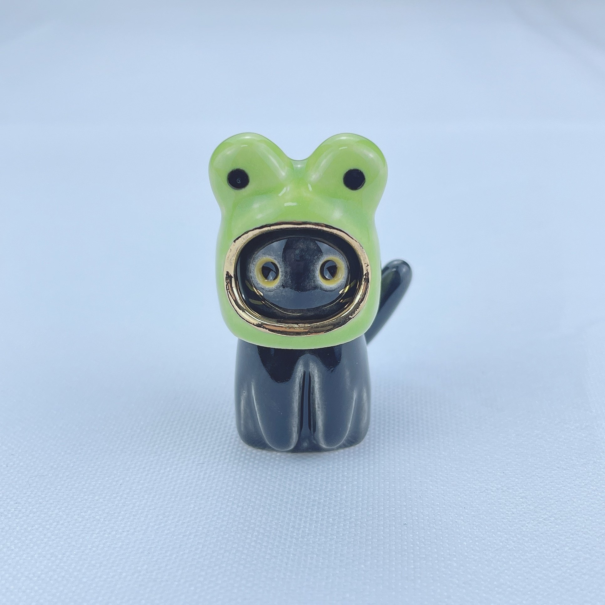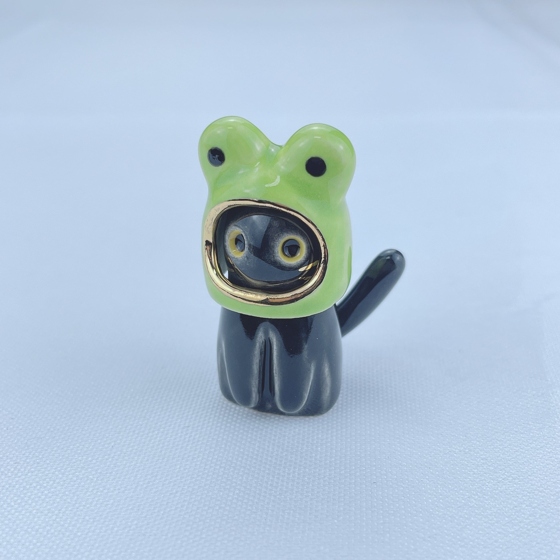 Black cat with frog hat ceramic figurine is made of low fire earthen clay and Duncan underglaze for ceramic. In order to achieve the final looking pieces, I put a lot of time and care into sculpting, glazing, and firing my pieces at the right temperature. Delicate 22k gold details are painted by hand in these pieces for elegant and shiny looking. Please handle them with care.