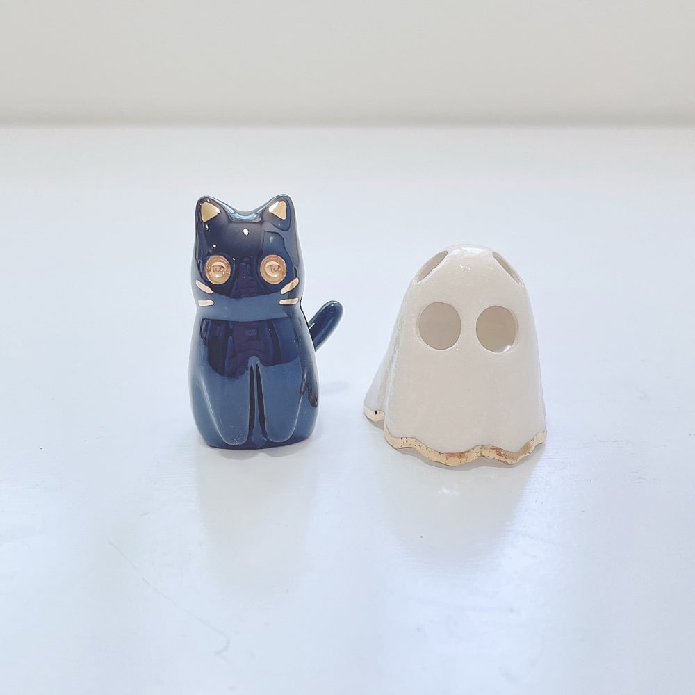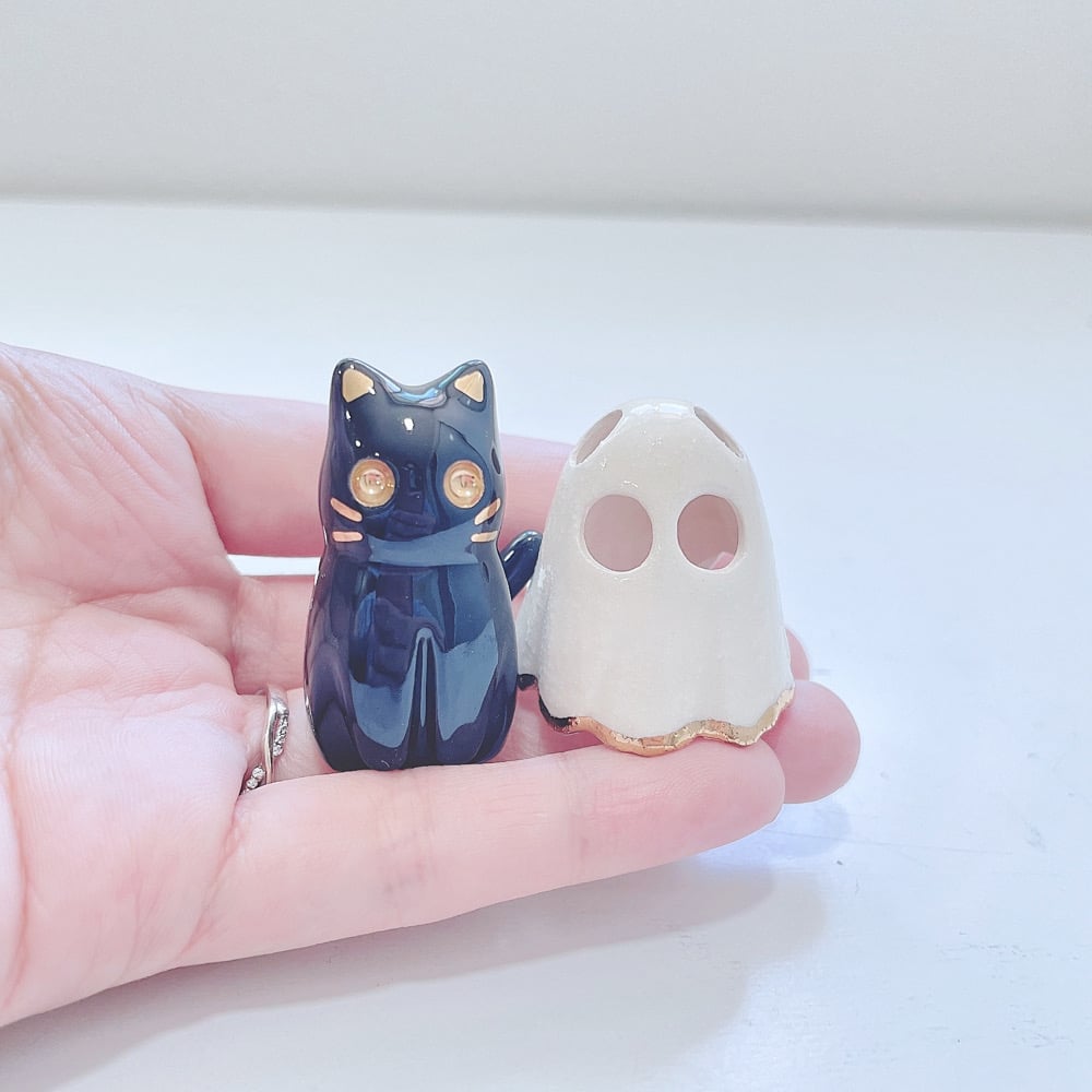 Black cat is made of low fire earthen clay and glow in dark glaze for ceramic. This cat ghost mask surface has bumpy texture naturally because of the glow in dark special mix glaze. Recharge glow in dark under the sun for 40 mins or under UV lamp for 10 mins. Glow light can only hold for 15-20 mins. In order to achieve the final looking pieces, I put a lot of time and care into sculpting, glazing, and firing my pieces at the right temperature. Delicate 22k gold details are painted by hand in these pieces for elegant and shiny looking.