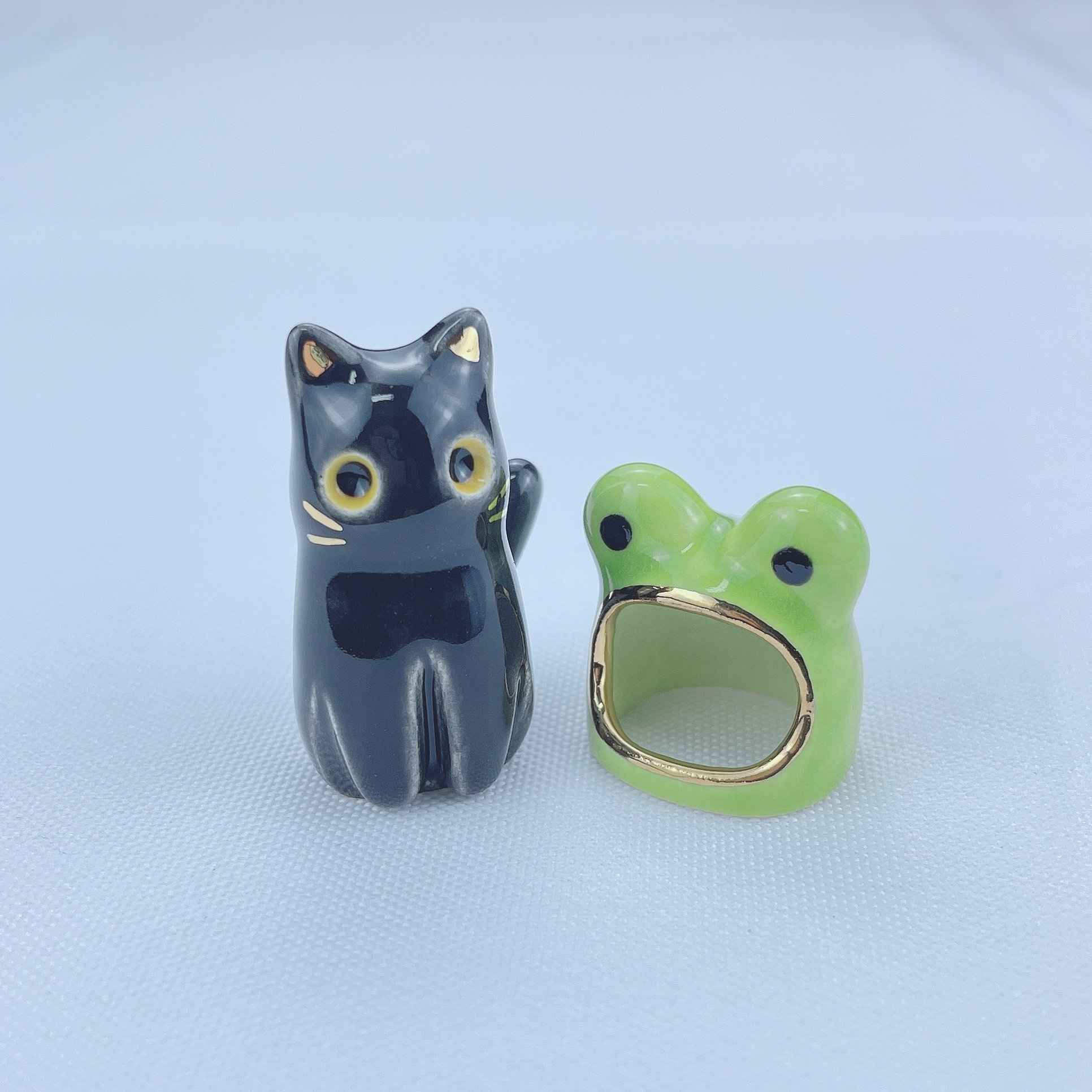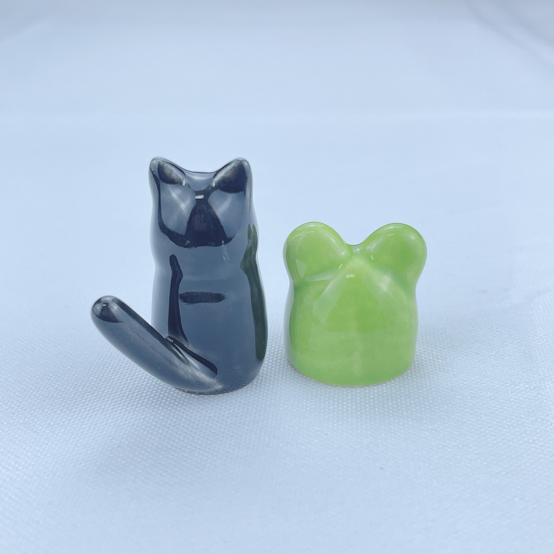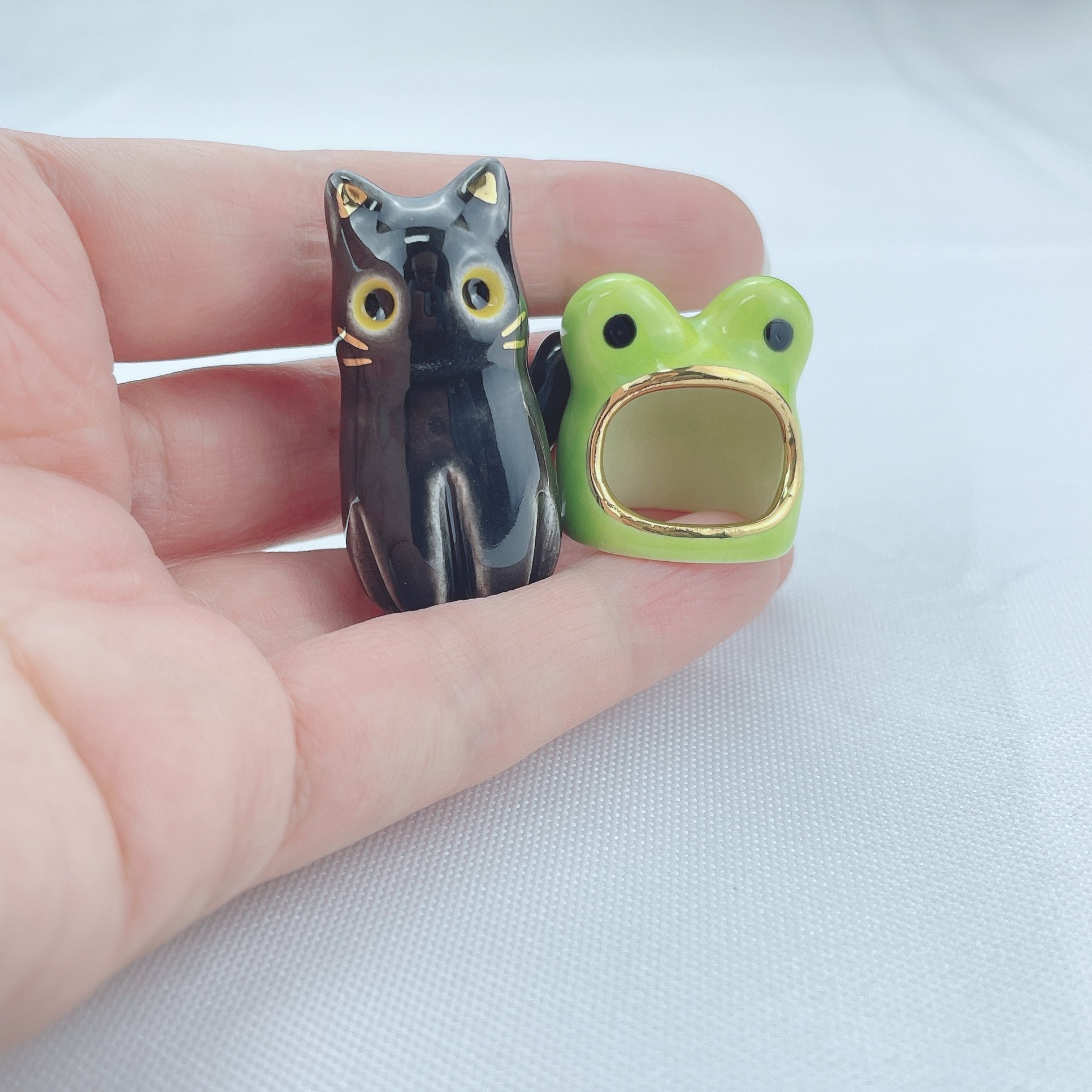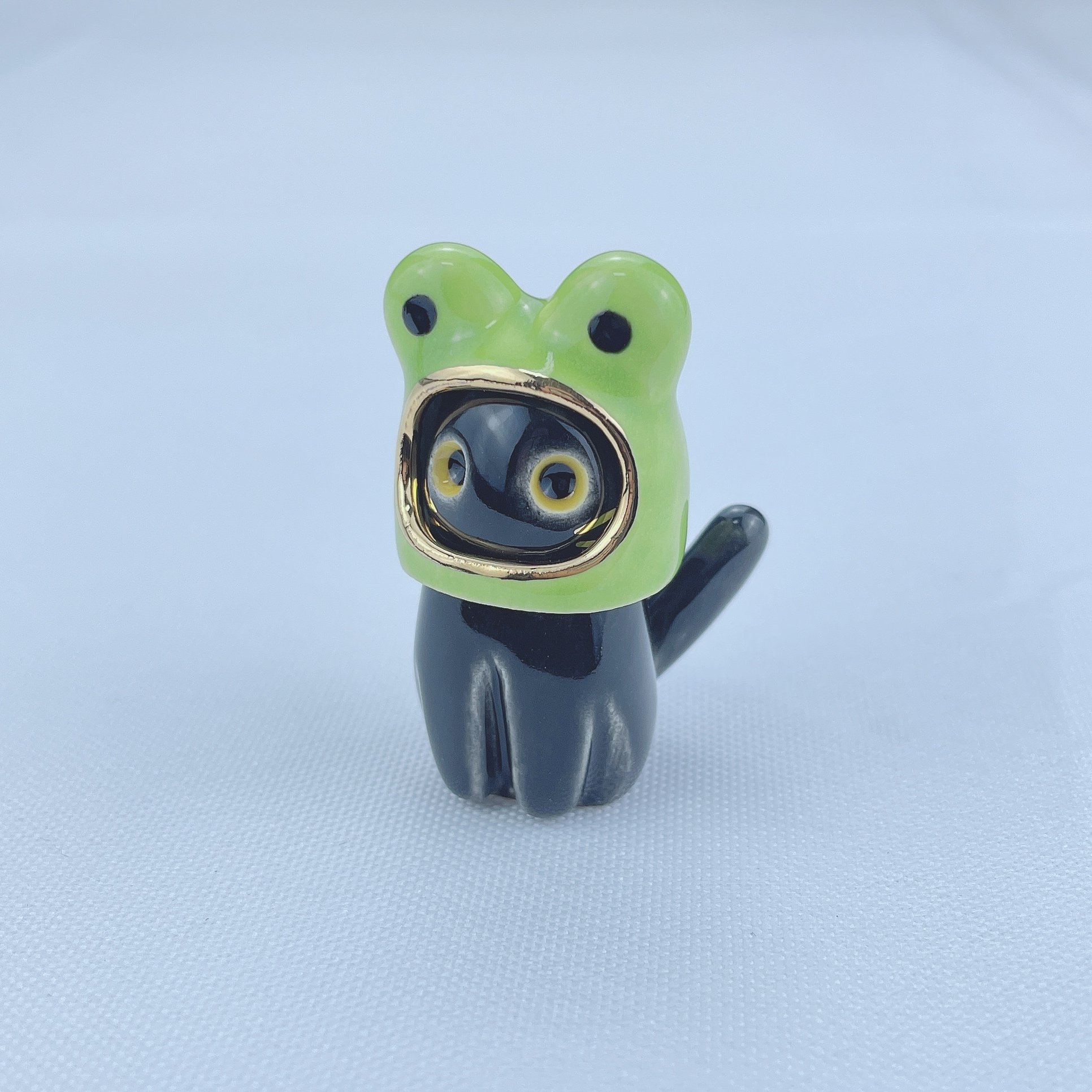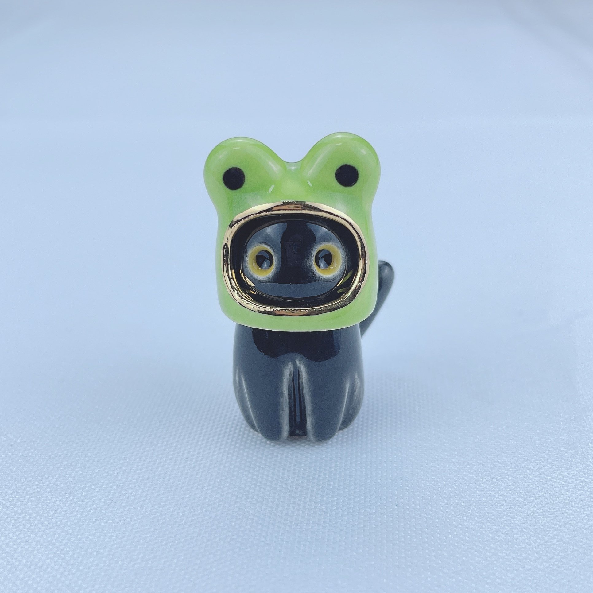 Black cat with frog hat ceramic figurine is made of low fire earthen clay and Duncan underglaze for ceramic. In order to achieve the final looking pieces, I put a lot of time and care into sculpting, glazing, and firing my pieces at the right temperature. Delicate 22k gold details are painted by hand in these pieces for elegant and shiny looking. Please handle them with care.
