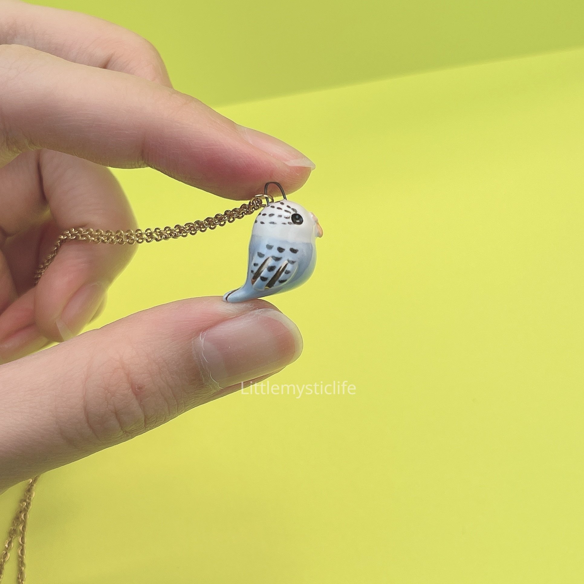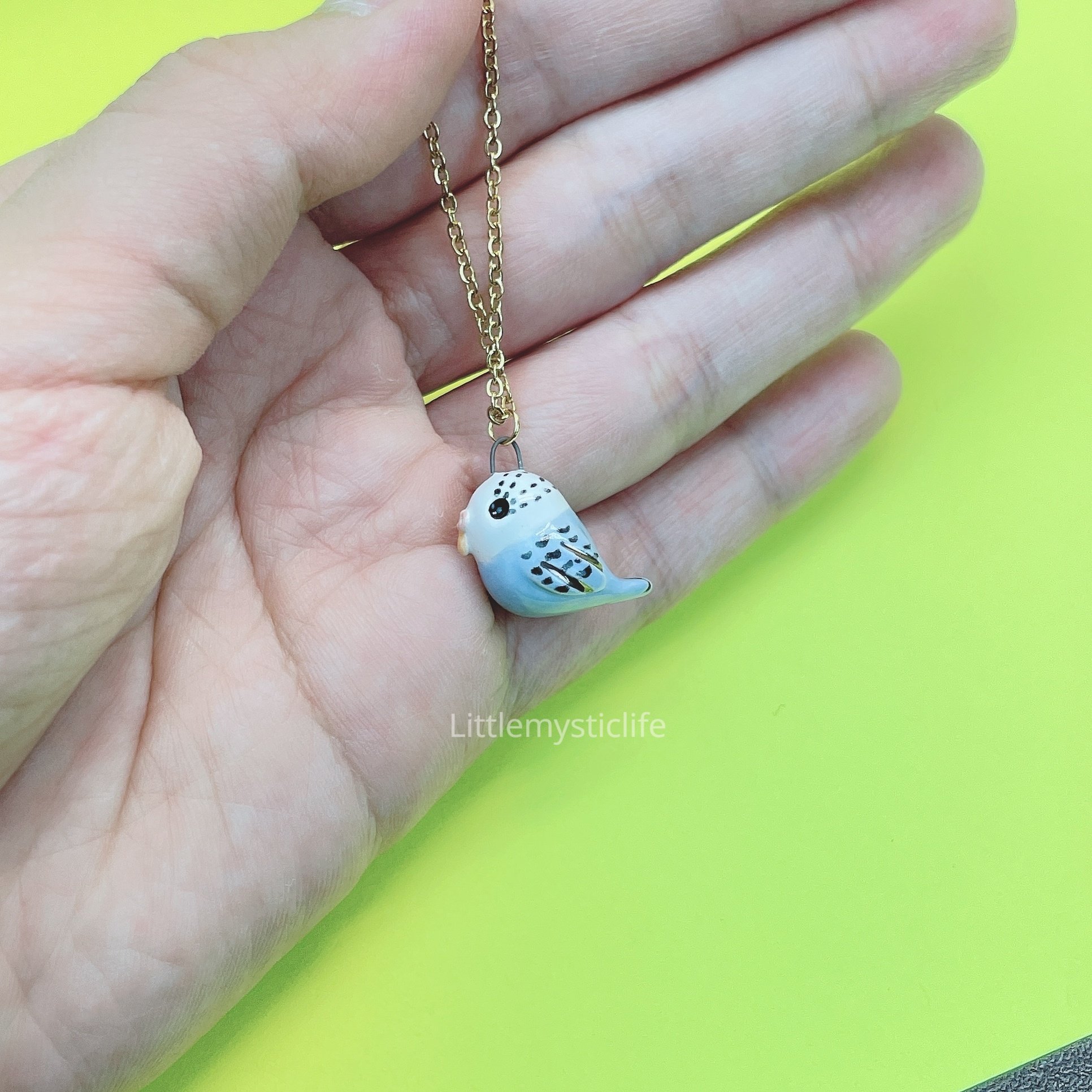 _Budgie ceramic necklace is made of low fire earthen clay and Duncan underglaze for ceramic. In order to achieve the final looking pieces, I put a lot of time and care into sculpting, glazing, and firing my pieces at the right temperature. Delicate 22k gold details are painted by hand in these pieces for elegant and shiny looking. All my pieces are very small (about as big as your thumb), please handle them with care and I recommend to take off your necklace while sleeping and showering.
