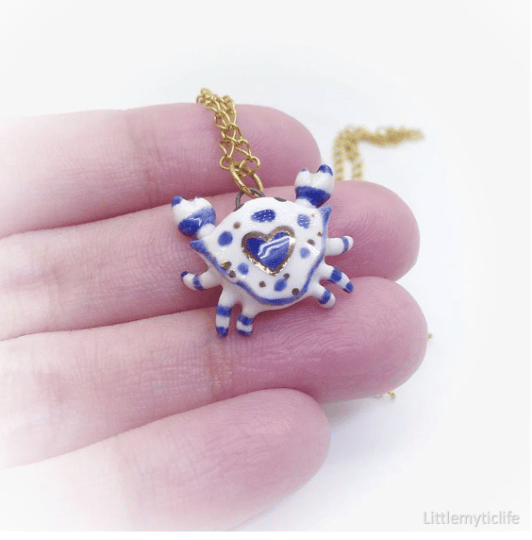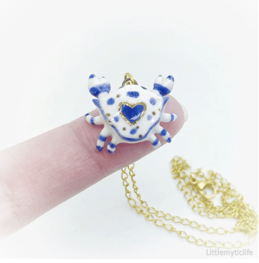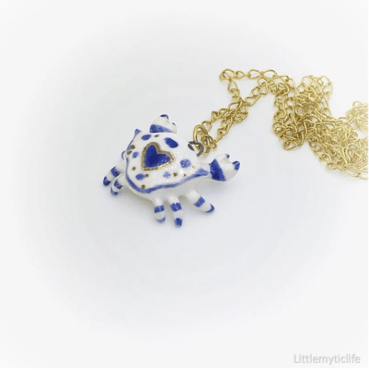 _Crab ceramic necklace is made of low fire earthen clay and Duncan underglaze for ceramic. In order to achieve the final looking pieces, I put a lot of time and care into sculpting, glazing, and firing my pieces at the right temperature. Delicate 22k gold details are painted by hand in these pieces for elegant and shiny looking. All my pieces are very small (about as big as your thumb), please handle them with care and I recommend to take off your necklace while sleeping and showering.