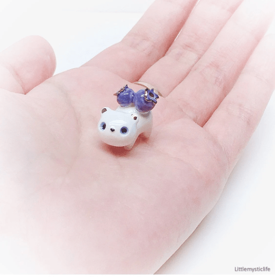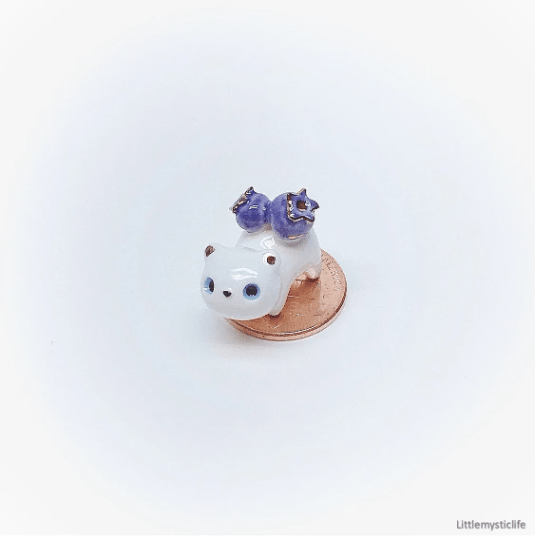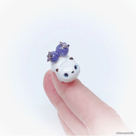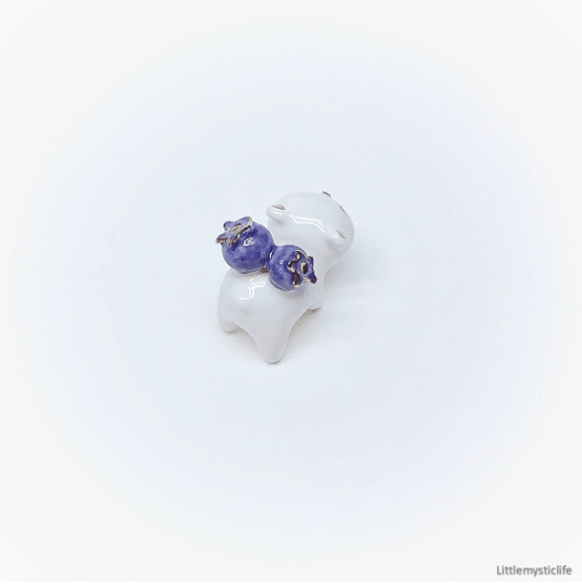 Blueberry bear ceramic figurine is made of low fire earthen clay and Duncan underglaze for ceramic. In order to achieve the final looking pieces, I put a lot of time and care into sculpting, glazing, and firing my pieces at the right temperature. Delicate 22k gold details are painted by hand in these pieces for elegant and shiny looking. All my pieces are very small (about as big as your thumb), please handle them with care.