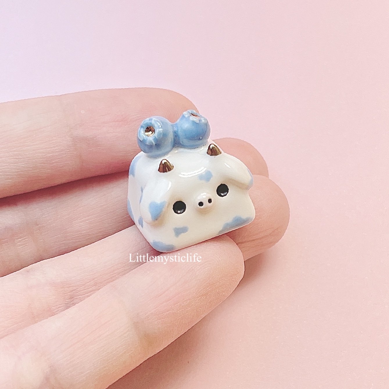 Keycap blueberry cow is made of low fire earthen clay and Duncan underglaze for ceramic. In order to achieve the final looking pieces, I put a lot of time and care into sculpting, glazing, and firing my pieces at the right temperature. Delicate 22k gold details are painted by hand in these pieces for elegant and shiny looking. All my pieces are very small (about as big as your thumb), please handle them with care.