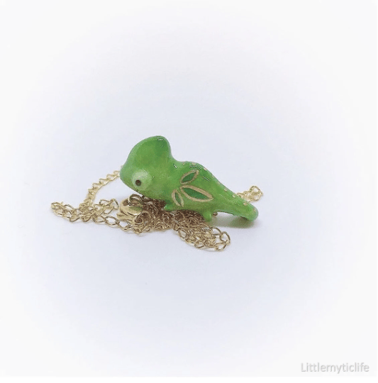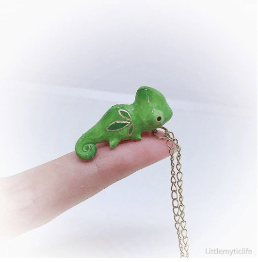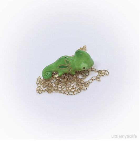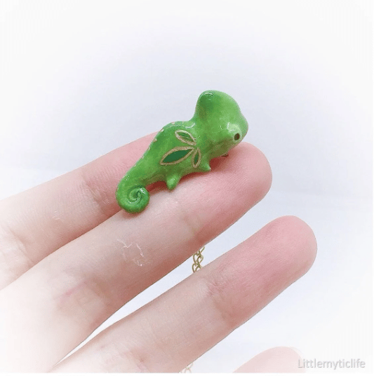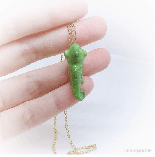 _Chameleon ceramic necklace is made of low fire earthen clay and Duncan underglaze for ceramic. In order to achieve the final looking pieces, I put a lot of time and care into sculpting, glazing, and firing my pieces at the right temperature. Delicate 22k gold details are painted by hand in these pieces for elegant and shiny looking. All my pieces are very small (about as big as your thumb), please handle them with care and I recommend to take off your necklace while sleeping and showering.
