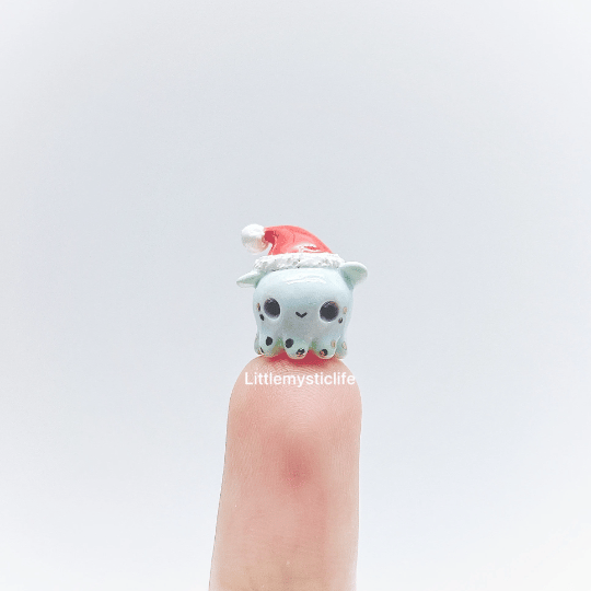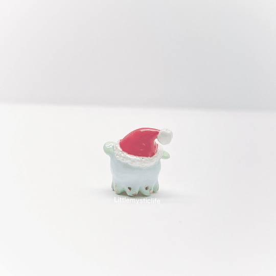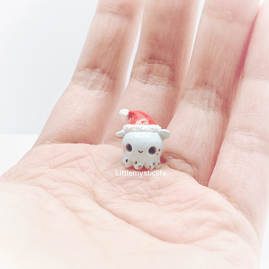 Christmas hat dumbo octopus ceramic figurine is made of low fire earthen clay and Duncan underglaze for ceramic. In order to achieve the final looking pieces, I put a lot of time and care into sculpting, glazing, and firing my pieces at the right temperature. Delicate 22k gold details are painted by hand in these pieces for elegant and shiny looking. All my pieces are very small (about as big as your thumb), please handle them with care.