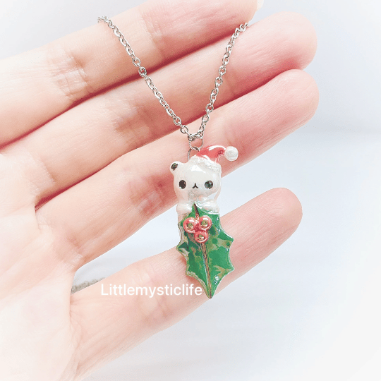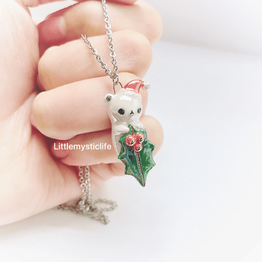 _Christmas mistletoe bear ceramic necklace is made of low fire earthen clay and Duncan underglaze for ceramic. In order to achieve the final looking pieces, I put a lot of time and care into sculpting, glazing, and firing my pieces at the right temperature. Delicate 22k gold details are painted by hand in these pieces for elegant and shiny looking. All my pieces are very small (about as big as your thumb), please handle them with care and I recommend to take off your necklace while sleeping and showering.