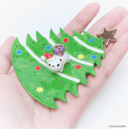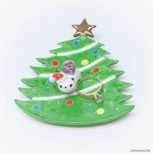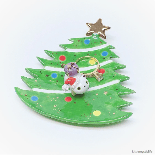 Christmas tree bear guardian ring dish is made of low fire earthen clay and Duncan underglaze for ceramic. In order to achieve the final looking pieces, I put a lot of time and care into sculpting, glazing, and firing my pieces at the right temperature. Delicate 22k gold details are painted by hand in these pieces for elegant and shiny looking. All my pieces are very small (about as big as your thumb), please handle them with care.