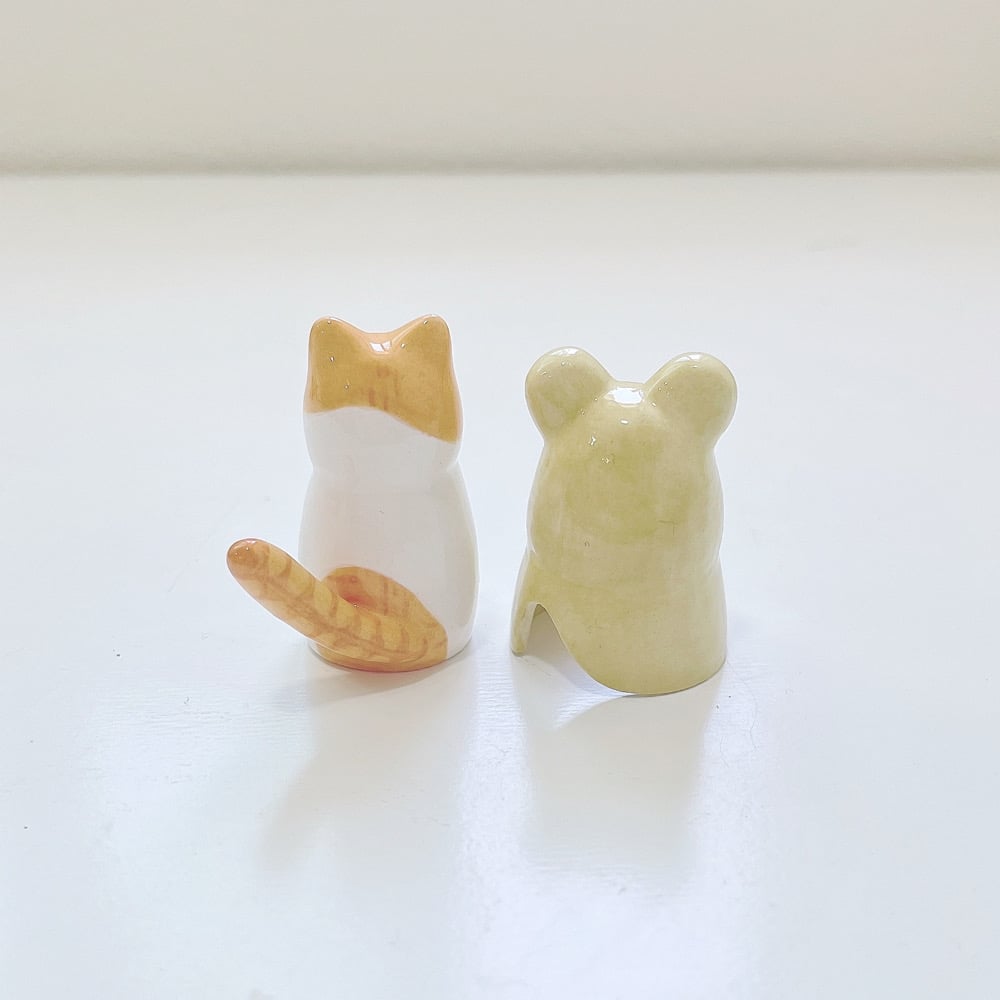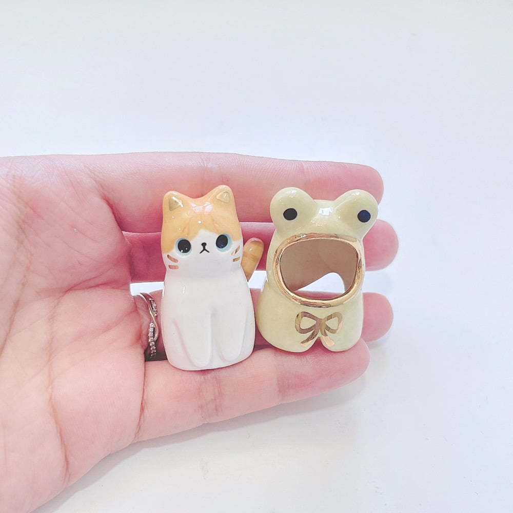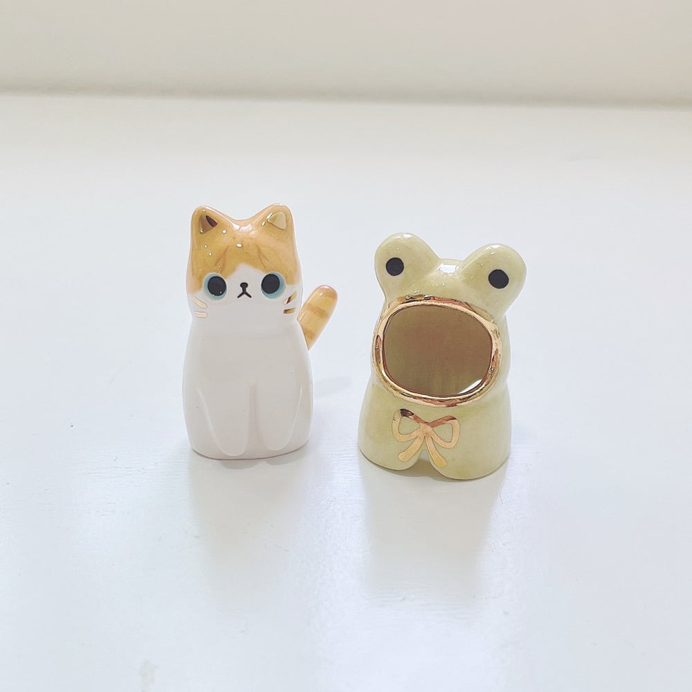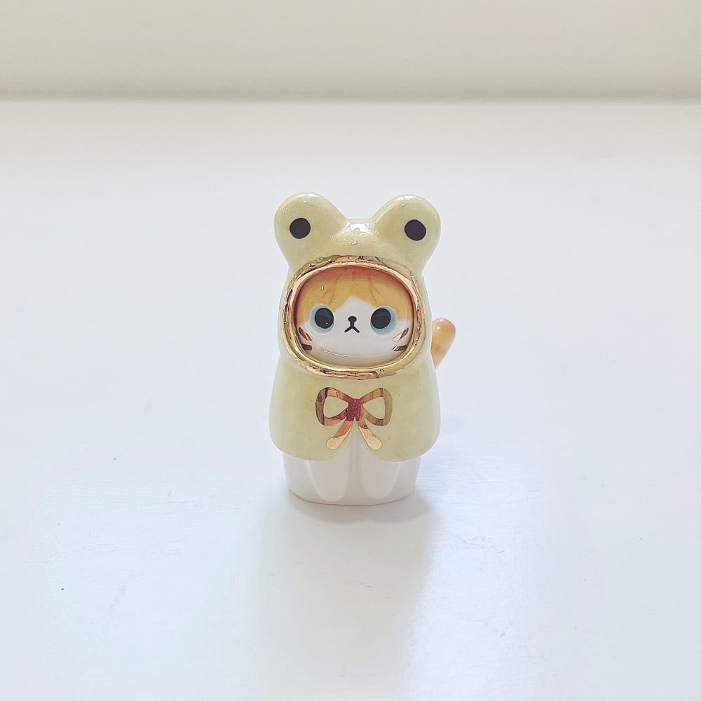 Orange cat with frog ponchos coat ceramic figurine is made of low fire earthen clay and Duncan underglaze for ceramic. In order to achieve the final looking pieces, I put a lot of time and care into sculpting, glazing, and firing my pieces at the right temperature. Delicate 22k gold details are painted by hand in these pieces for elegant and shiny looking. Please handle them with care.