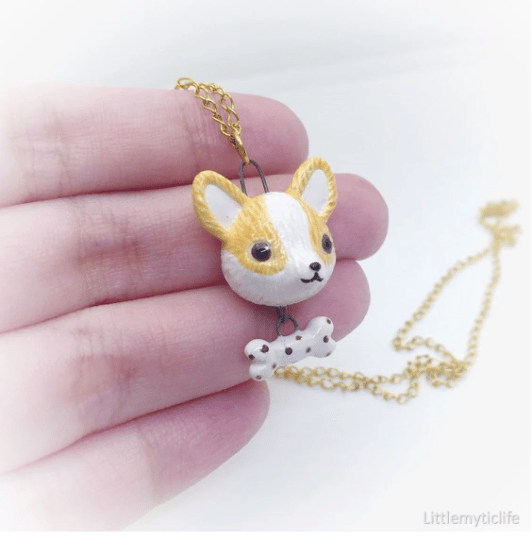_Corgi ceramic necklace is made of low fire earthen clay and Duncan underglaze for ceramic. In order to achieve the final looking pieces, I put a lot of time and care into sculpting, glazing, and firing my pieces at the right temperature. Delicate 22k gold details are painted by hand in these pieces for elegant and shiny looking. All my pieces are very small (about as big as your thumb), please handle them with care and I recommend to take off your necklace while sleeping and showering.