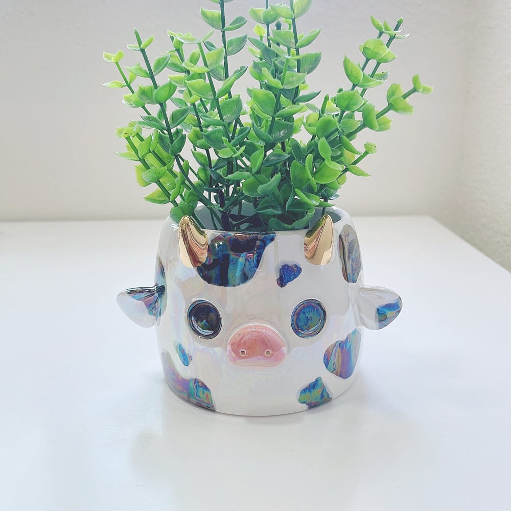 small Cow planter is made of low fire earthen clay and Duncan underglaze for ceramic. In order to achieve the final looking pieces, I put a lot of time and care into sculpting, glazing, and firing my pieces at the right temperature. Delicate 22k gold details are painted by hand in these pieces for elegant and shiny looking. This cow planter also has holographic effect. Please handle them with care.