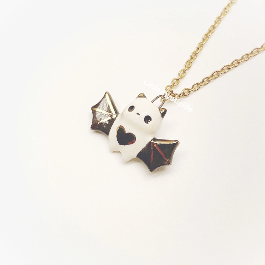 _Cute black bat ceramic necklace is made of low fire earthen clay and Duncan underglaze for ceramic. In order to achieve the final looking pieces, I put a lot of time and care into sculpting, glazing, and firing my pieces at the right temperature. Delicate 22k gold details are painted by hand in these pieces for elegant and shiny looking. All my pieces are very small (about as big as your thumb), please handle them with care and I recommend to take off your necklace while sleeping and showering.