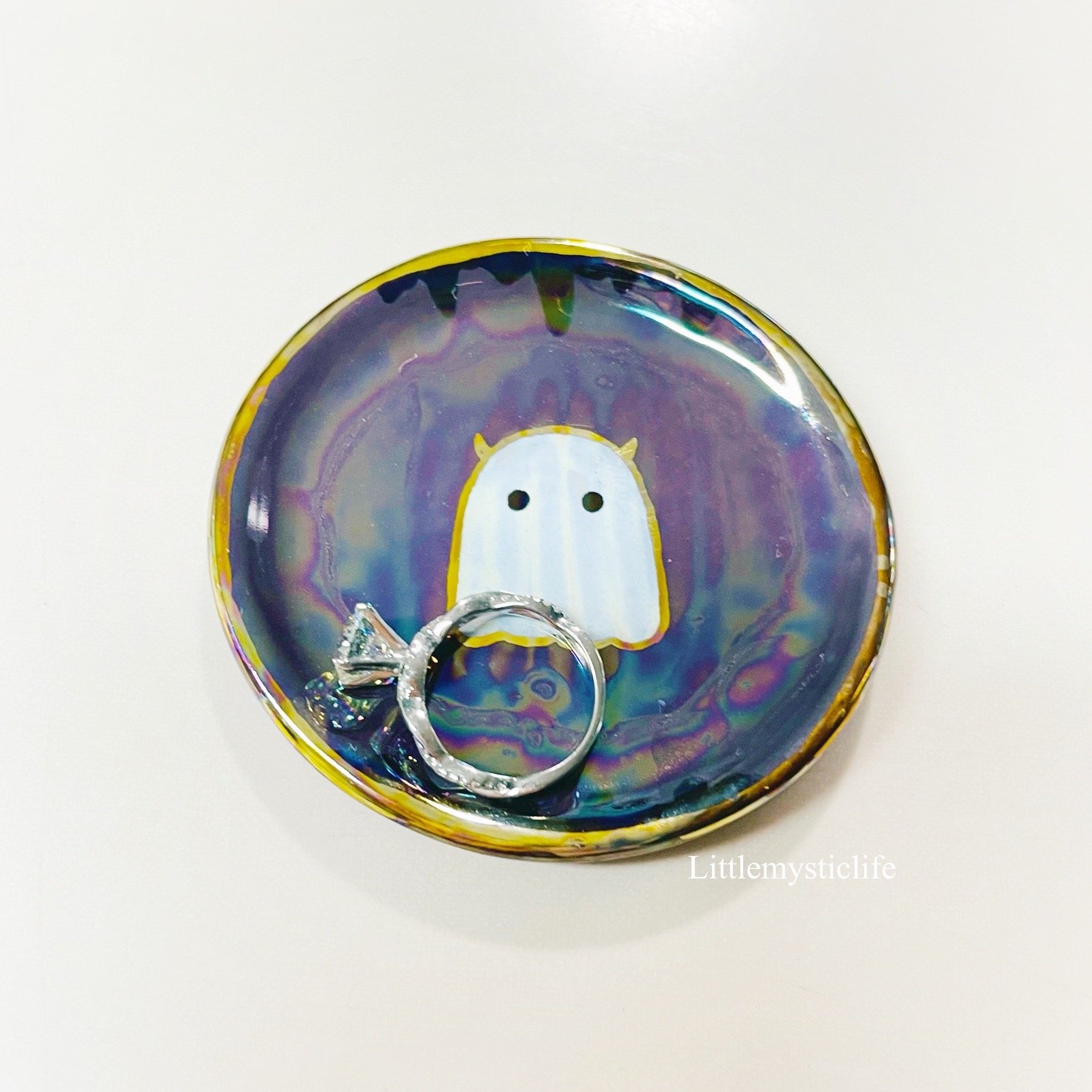 Mini Ghost trinket dish is made of low fire earthen clay and Duncan underglaze for ceramic. This small trinket dish is about 2.5 inches in diameter or 6 cm in diameter. In order to achieve the final looking pieces, I put a lot of time and care into sculpting, glazing, and firing my pieces at the right temperature. Delicate 22k gold details are painted by hand in these pieces for elegant and shiny looking. This dish also has rainbow effect.