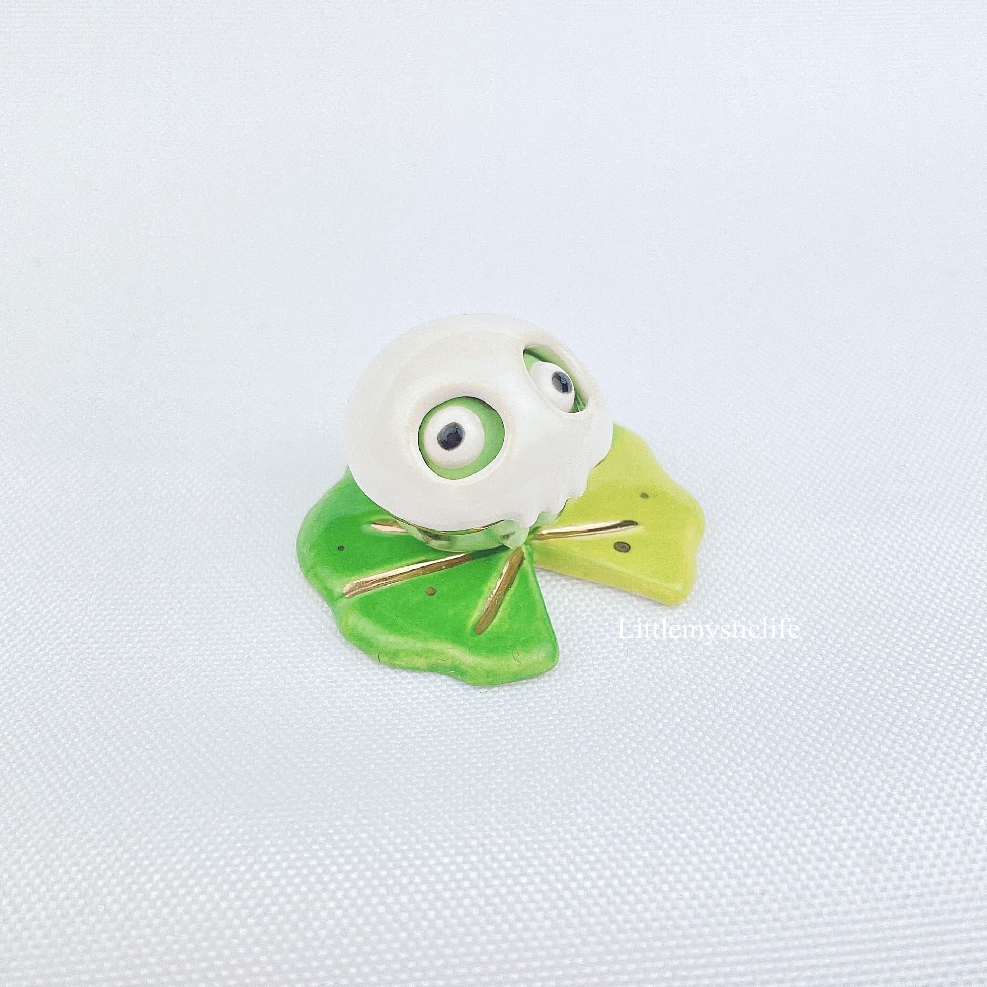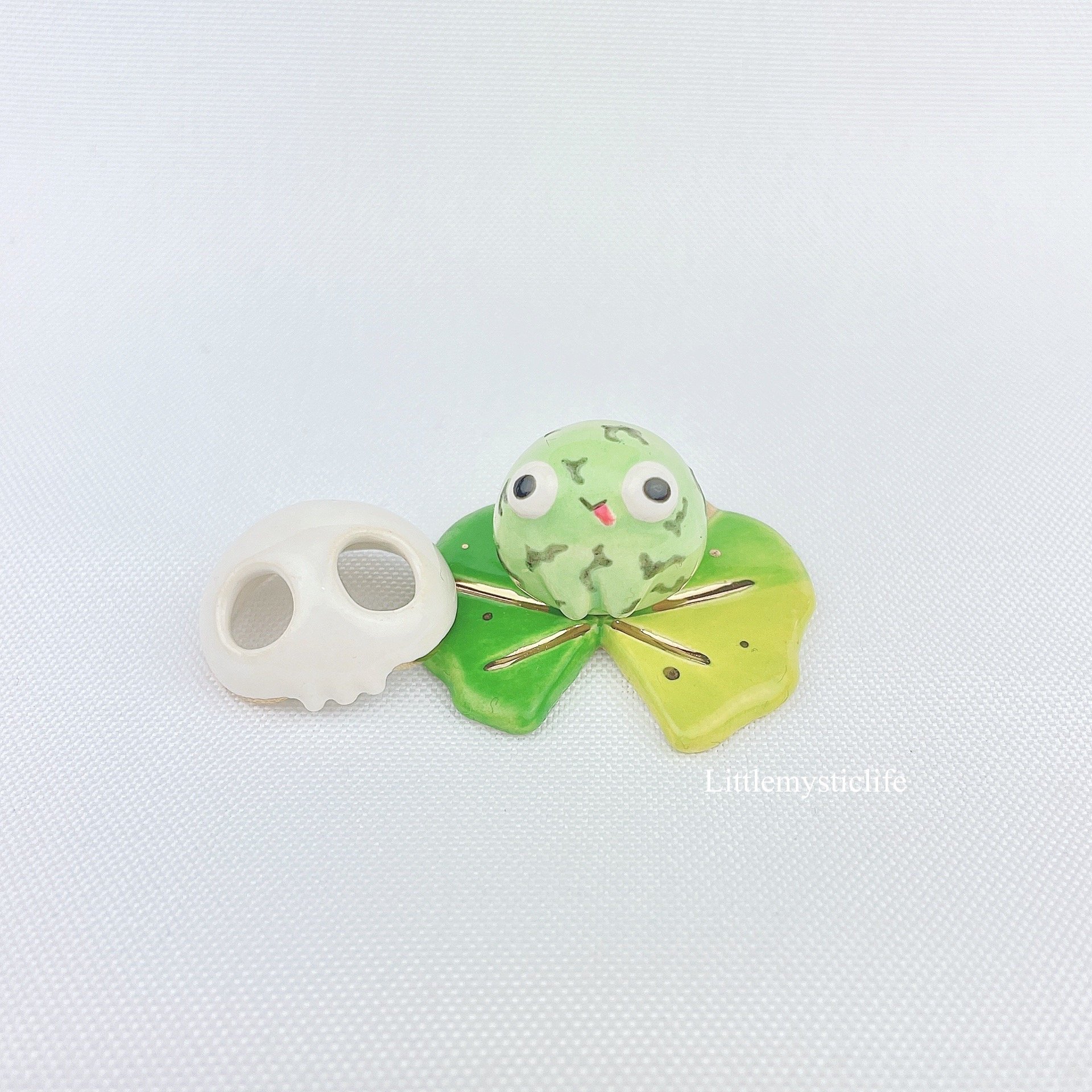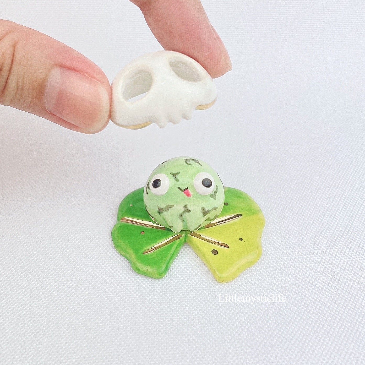 Zombie Frog on lily pad with skull mask ceramic figurine is made of low fire earthen clay and Duncan underglaze for ceramic. In order to achieve the final looking pieces, I put a lot of time and care into sculpting, glazing, and firing my pieces at the right temperature. Delicate 22k gold details are painted by hand in these pieces for elegant and shiny looking. Please handle them with care.