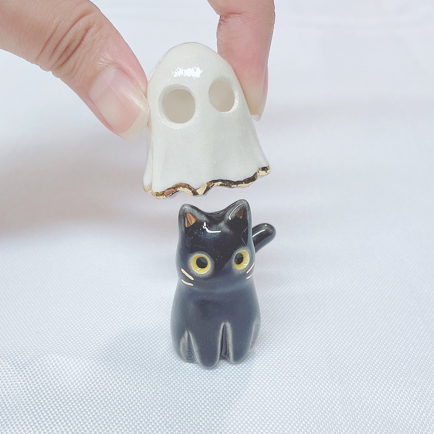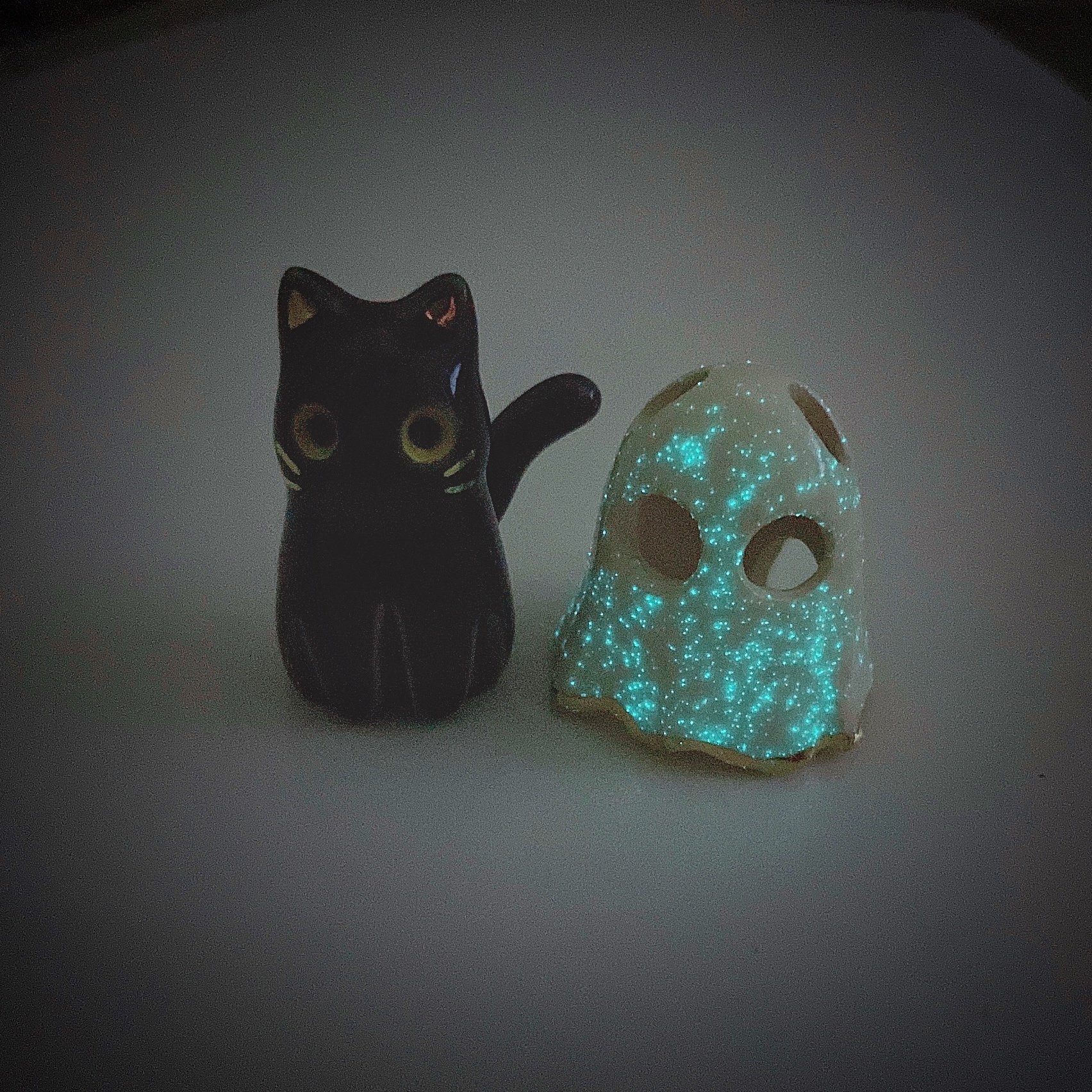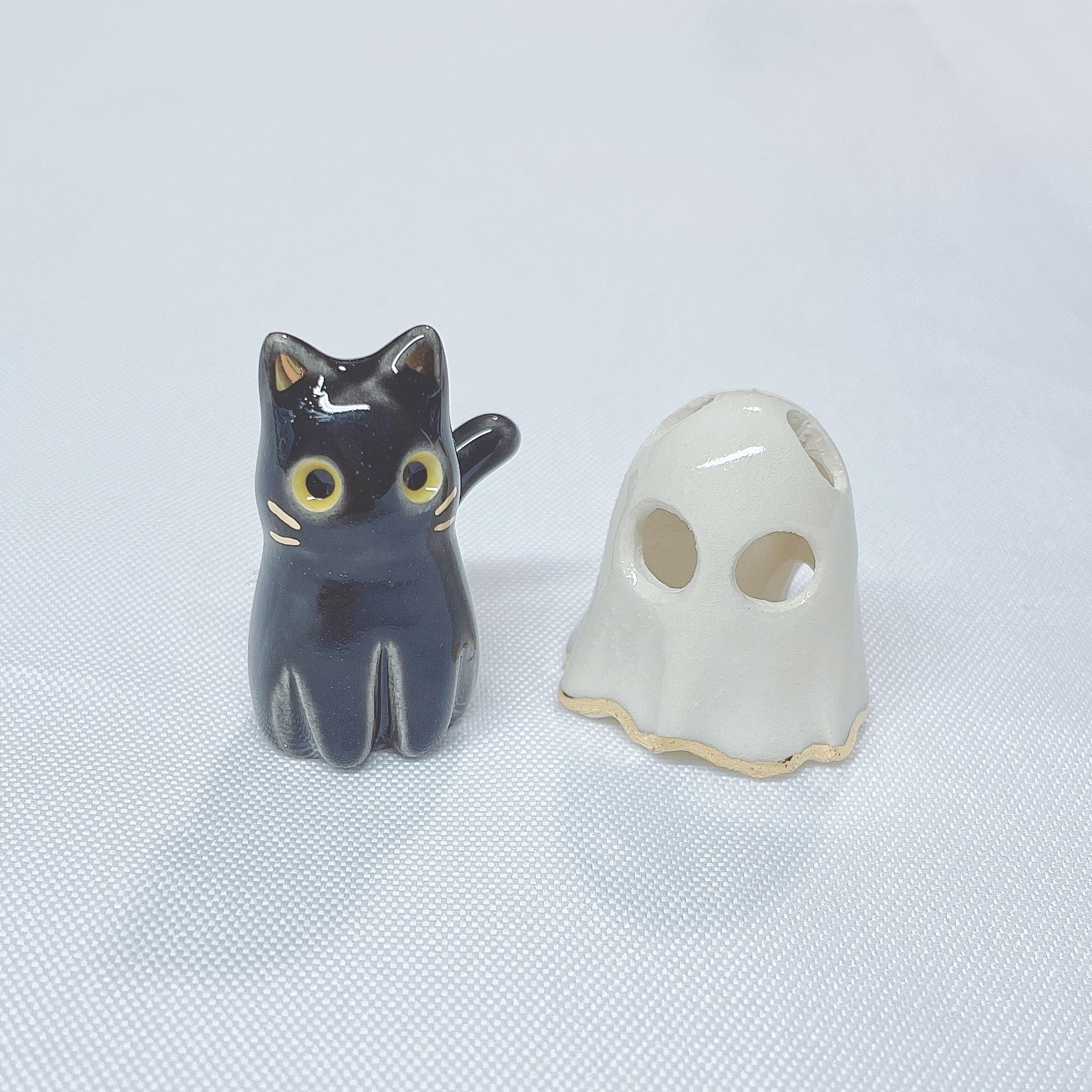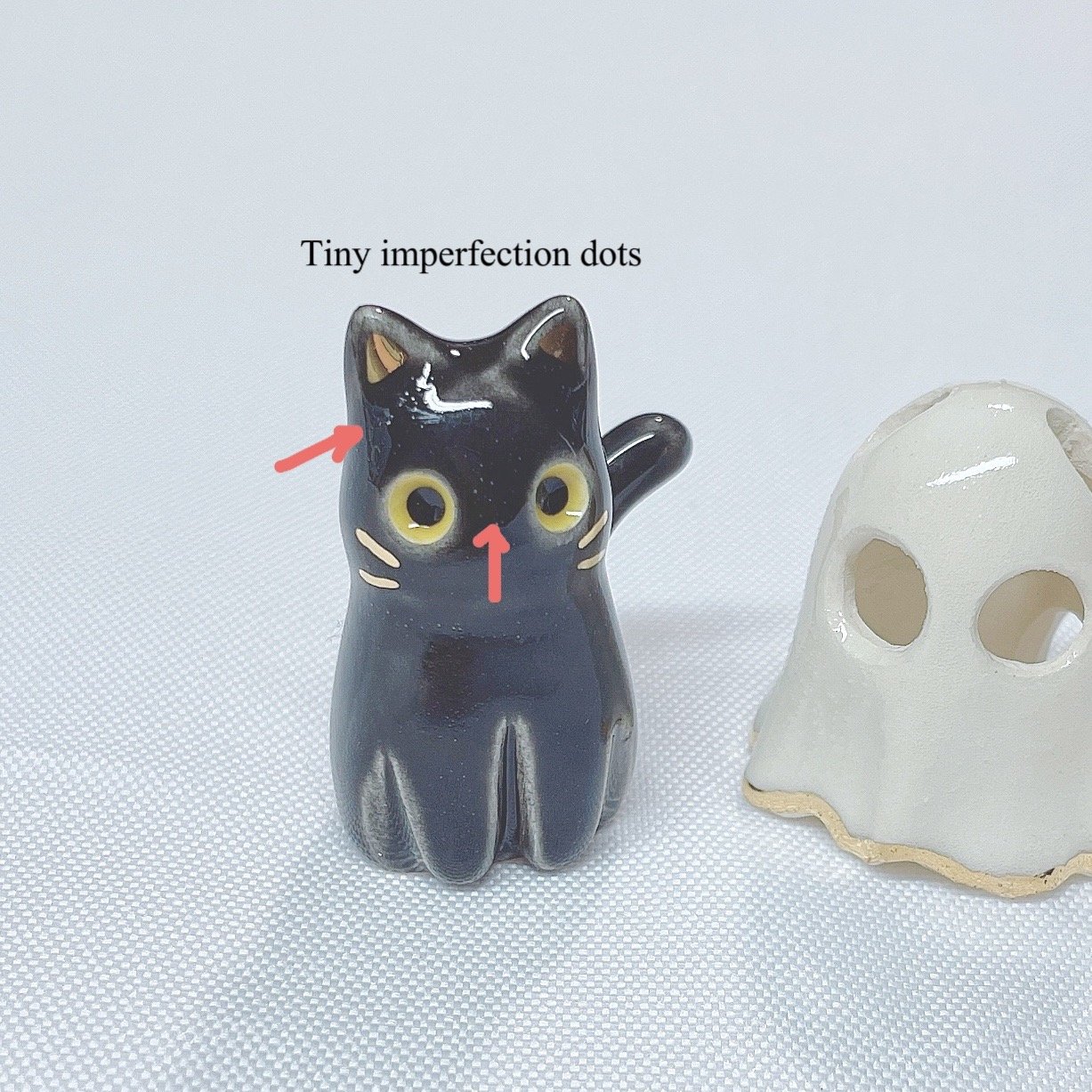 Glow In Dark Black Cat With Ghost Mask Ceramic Figurine (Discount price)