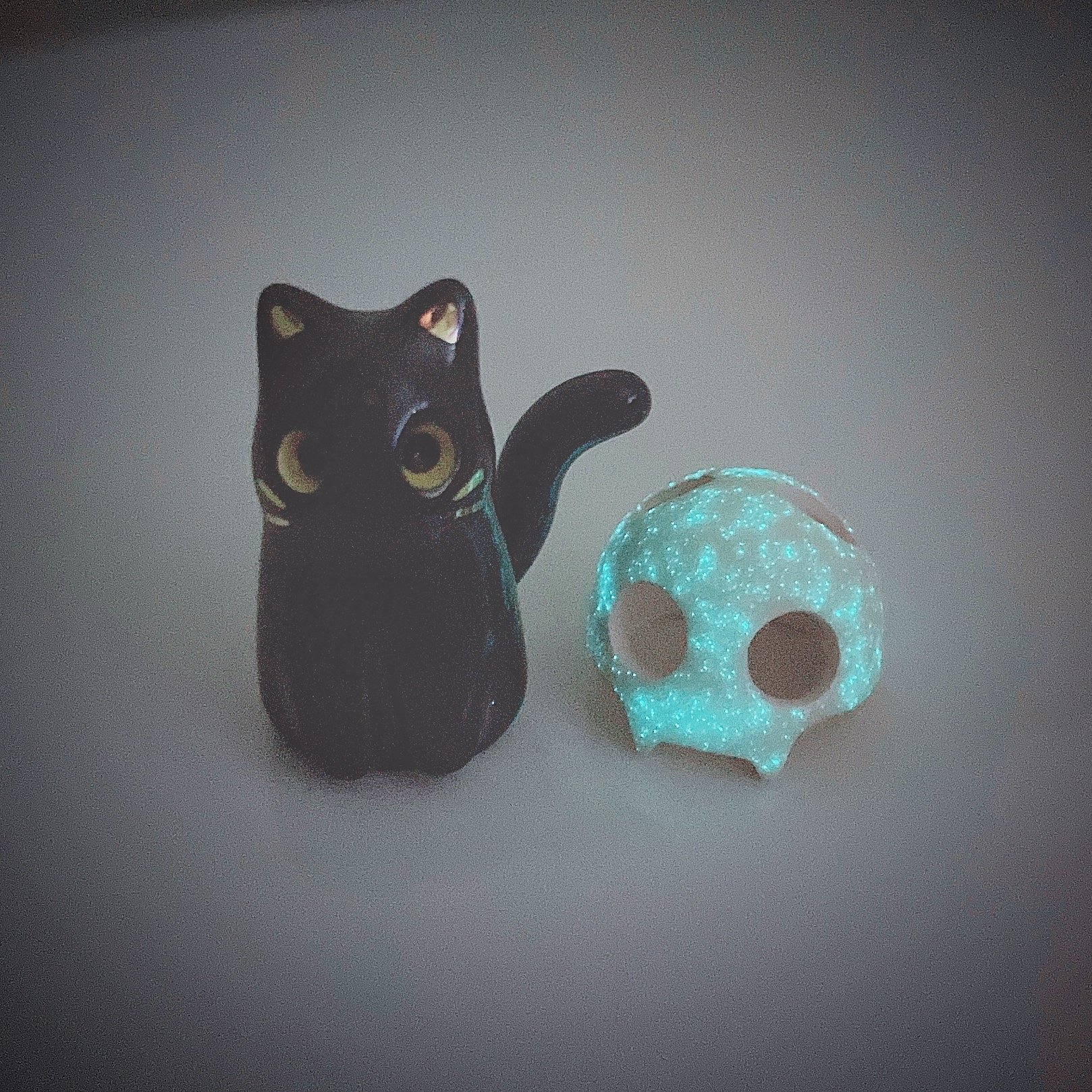 Black cat is made of low fire earthen clay and glow in dark glaze for ceramic. This cat skull mask surface has bumpy texture naturally because of the glow in dark special mix glaze. Recharge glow in dark everyday under the sun for 40 mins or under UV lamp for 10 mins. Glow light can hold for 15-20 mins. In order to achieve the final looking pieces, I put a lot of time and care into sculpting, glazing, and firing my pieces at the right temperature. Delicate 22k gold details are painted by hand in these pieces for elegant and shiny looking.