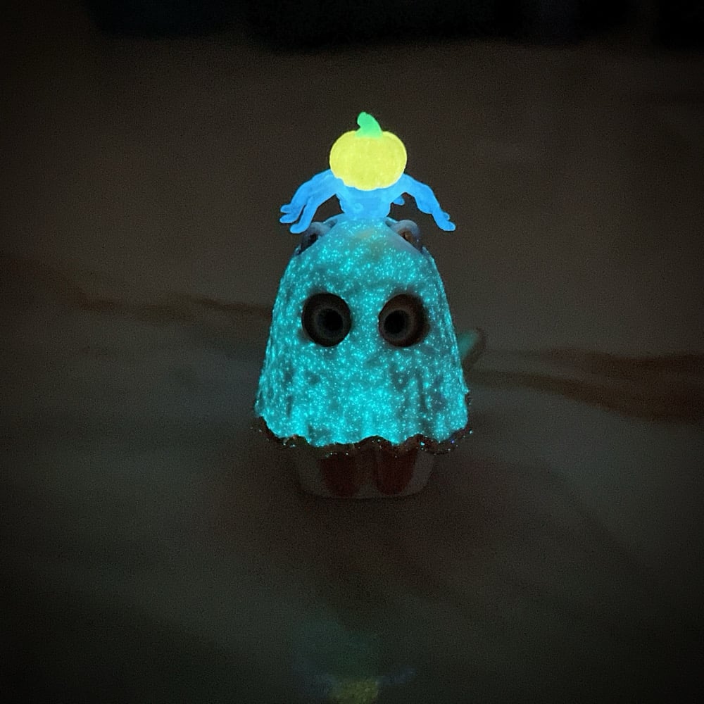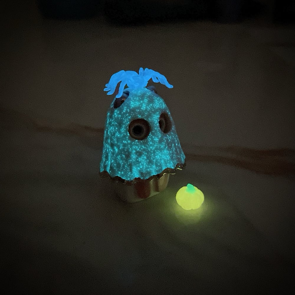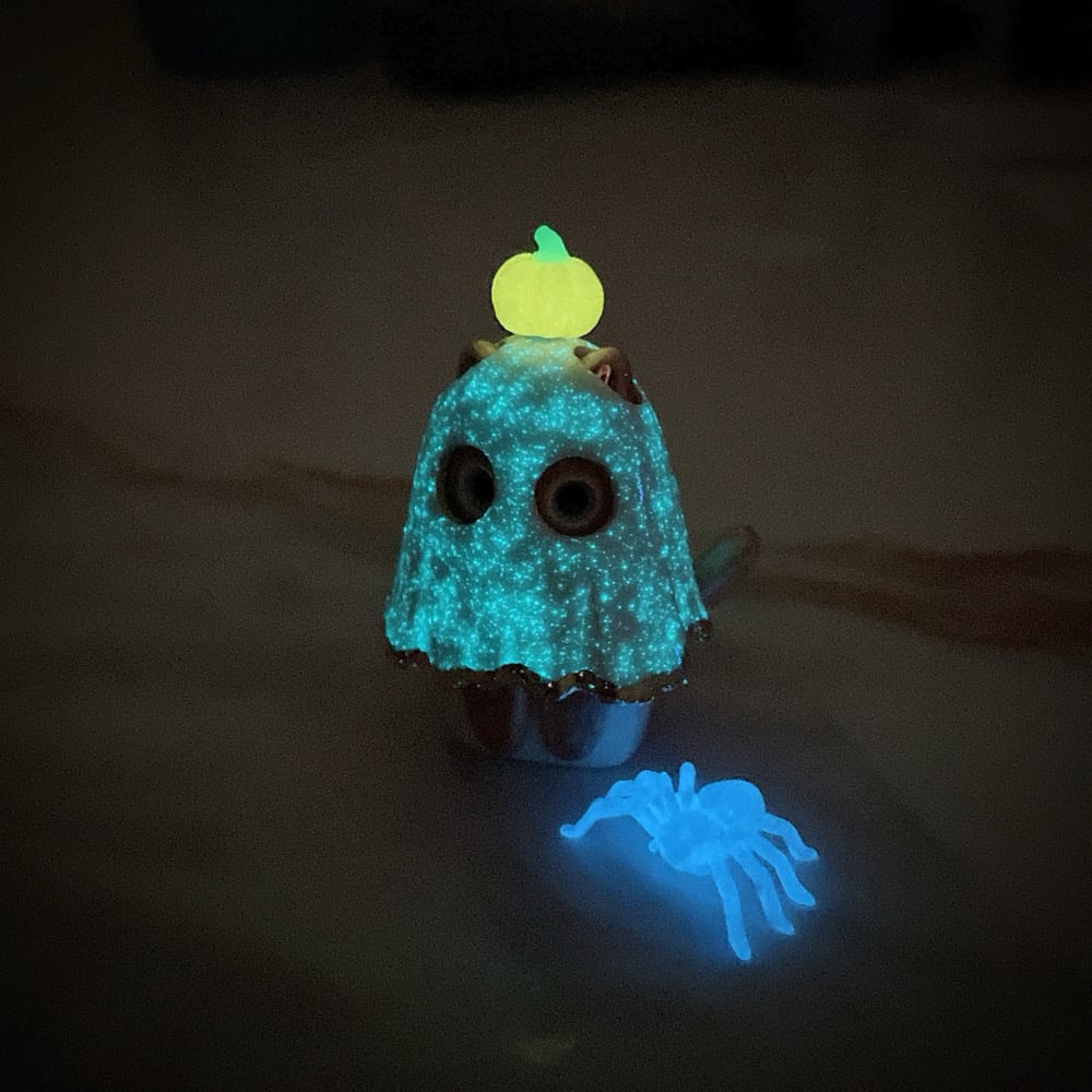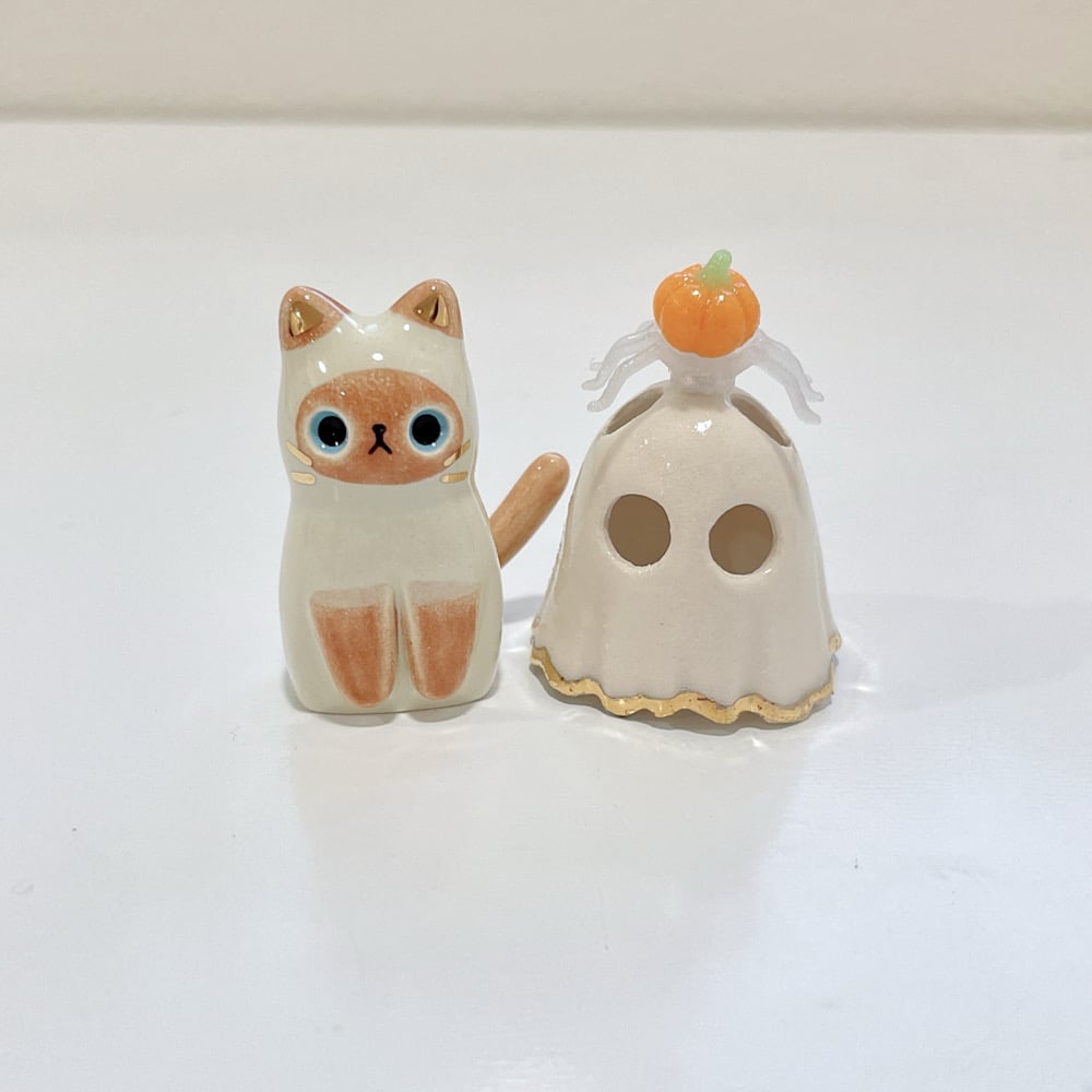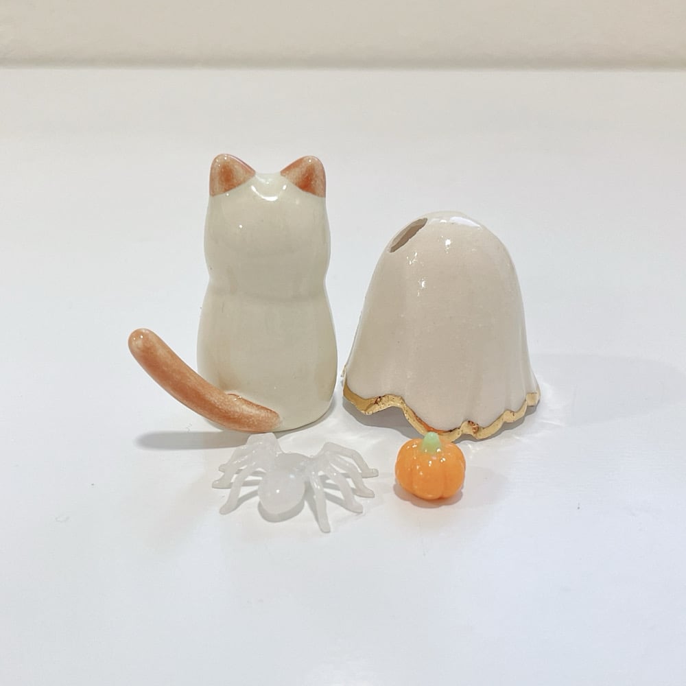 Glow in dark ghost mask, pumpkin, and spider flame point ragdoll cat ceramic figurine