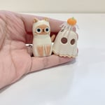 Glow in dark ghost mask, pumpkin, and spider flame point siamese cat ceramic figurine