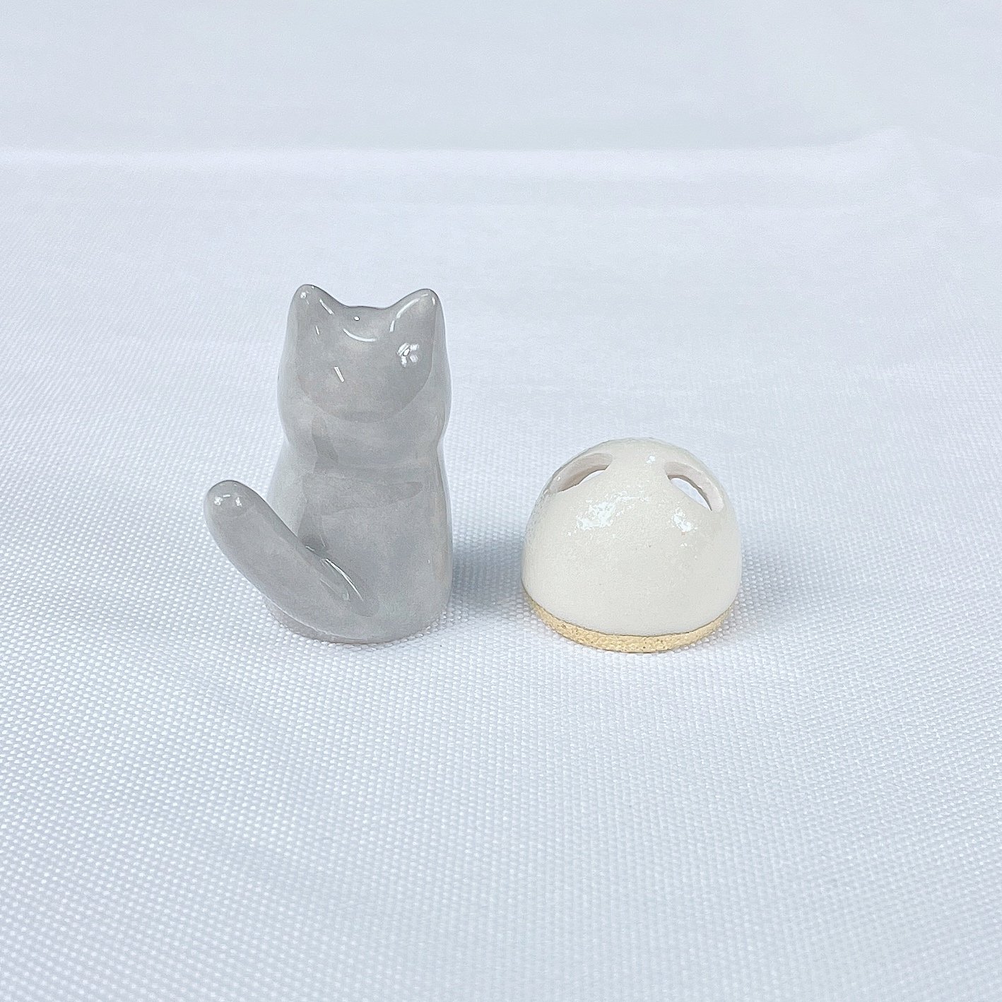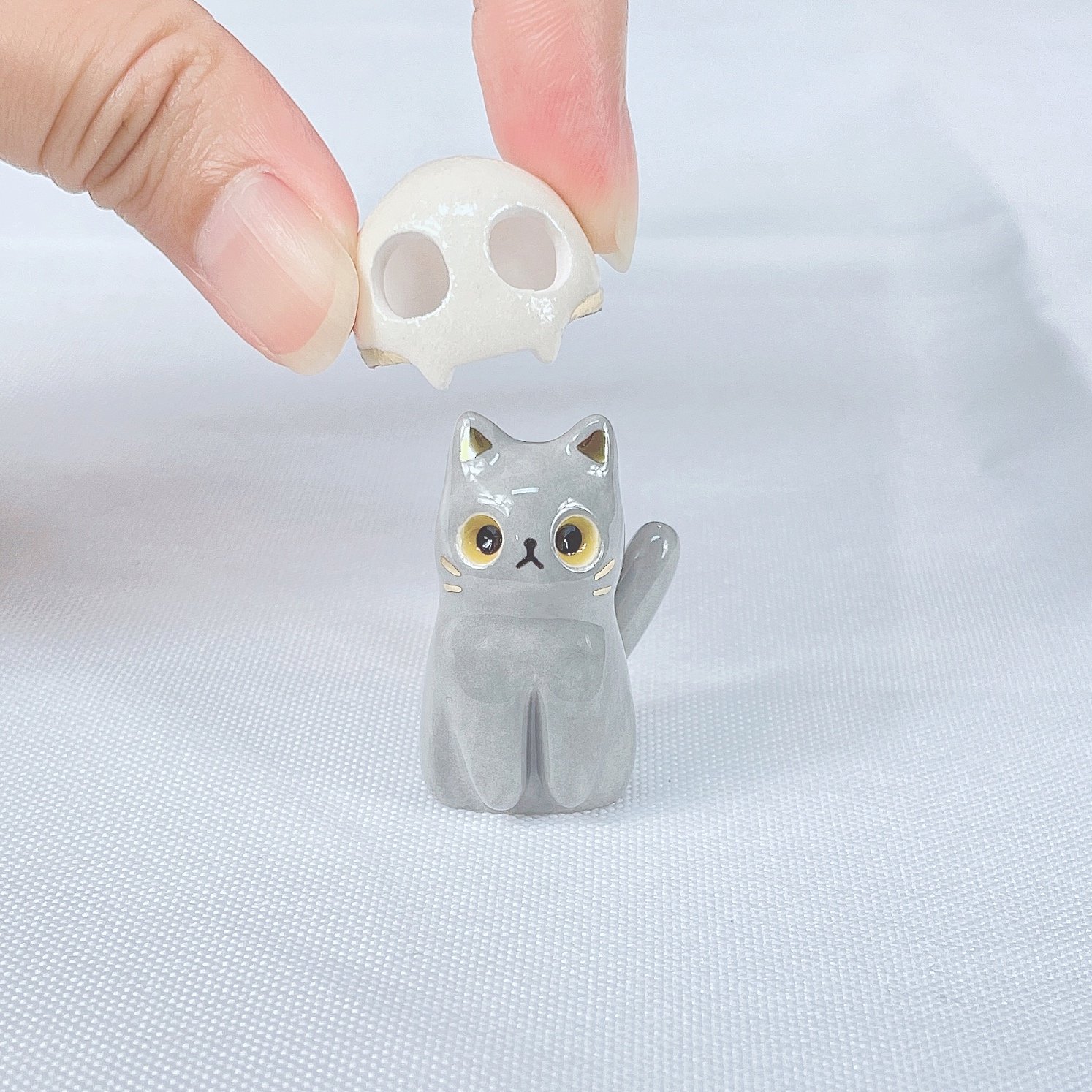 Glow in Dark Gray cat with skull mask ceramic figurine