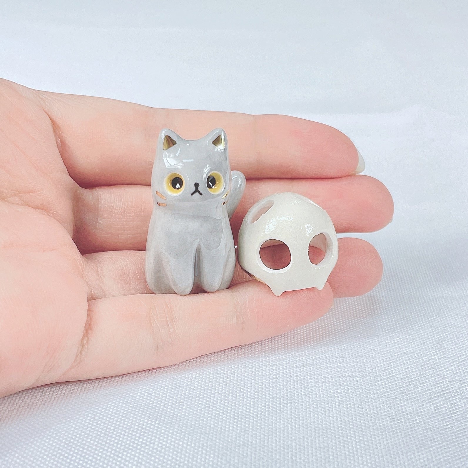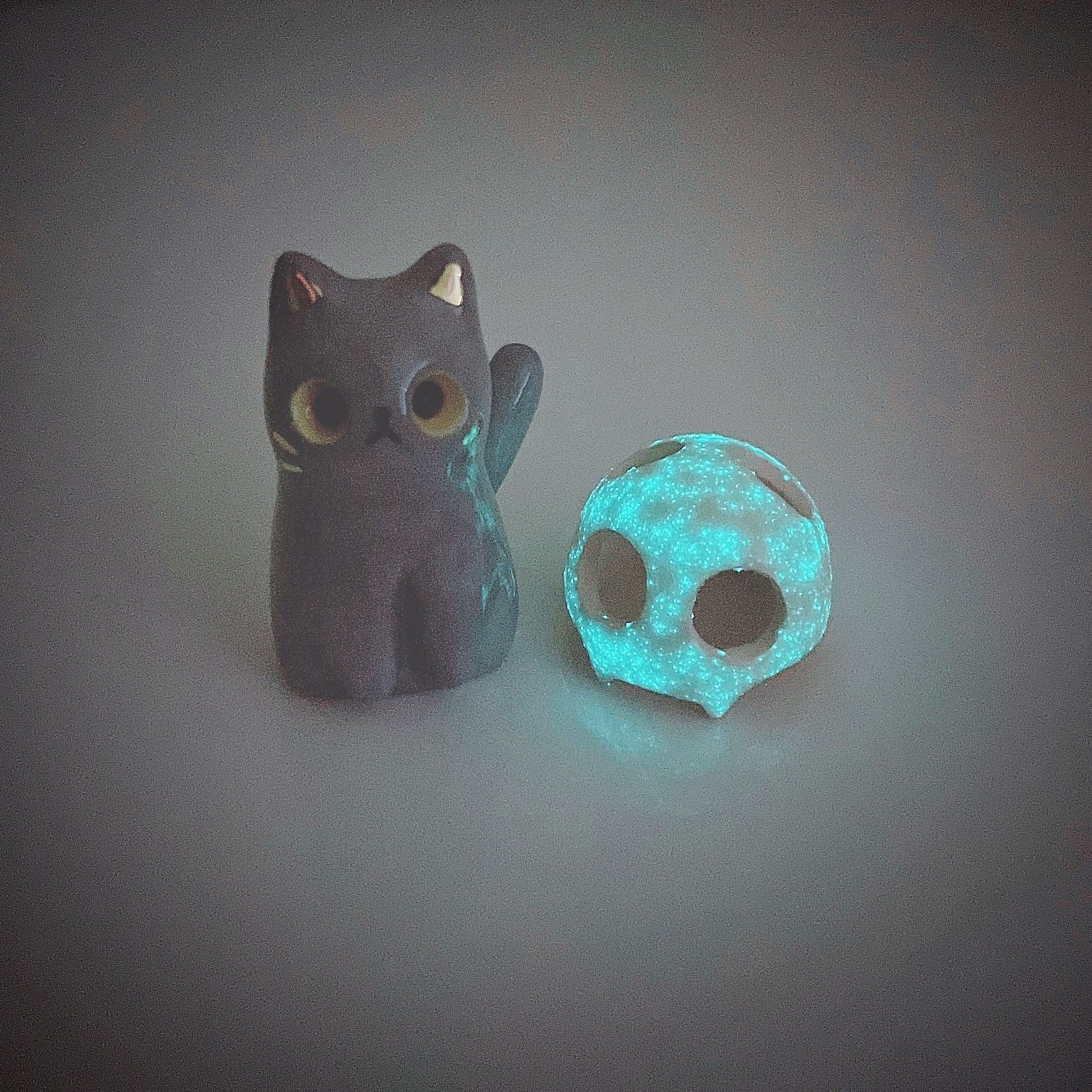Gray cat is made of low fire earthen clay and glow in dark glaze for ceramic. This cat skull mask surface has bumpy texture naturally because of the glow in dark special mix glaze. Recharge glow in dark everyday under the sun for 40 mins or under UV lamp for 10 mins. Glow light can hold for 15-20 mins. In order to achieve the final looking pieces, I put a lot of time and care into sculpting, glazing, and firing my pieces at the right temperature. Delicate 22k gold details are painted by hand in these pieces for elegant and shiny looking.