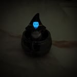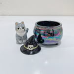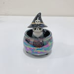 Glow in dark gray tabby cat in witch brew cauldron ceramic keepsake is made of low fire earthen clay. The tiny cat skull on thr hat glow in dark. In order to achieve the final looking pieces, I put a lot of time and care into sculpting, glazing, and firing my pieces at the right temperature. Delicate 22k gold details are painted by hand in these pieces for elegant and shiny looking. The cauldron has rainbow effect!
