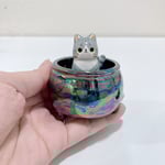 Glow in dark gray tabby cat in witch brew cauldron ceramic keepsake (rainbow effect)