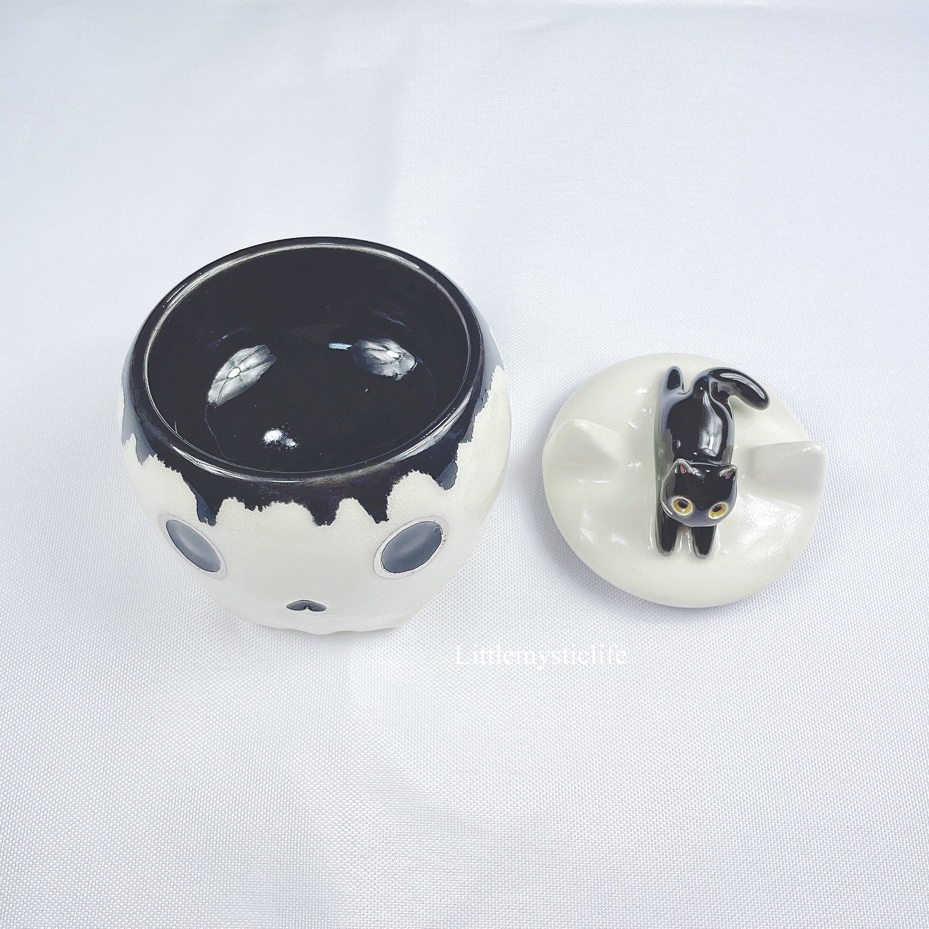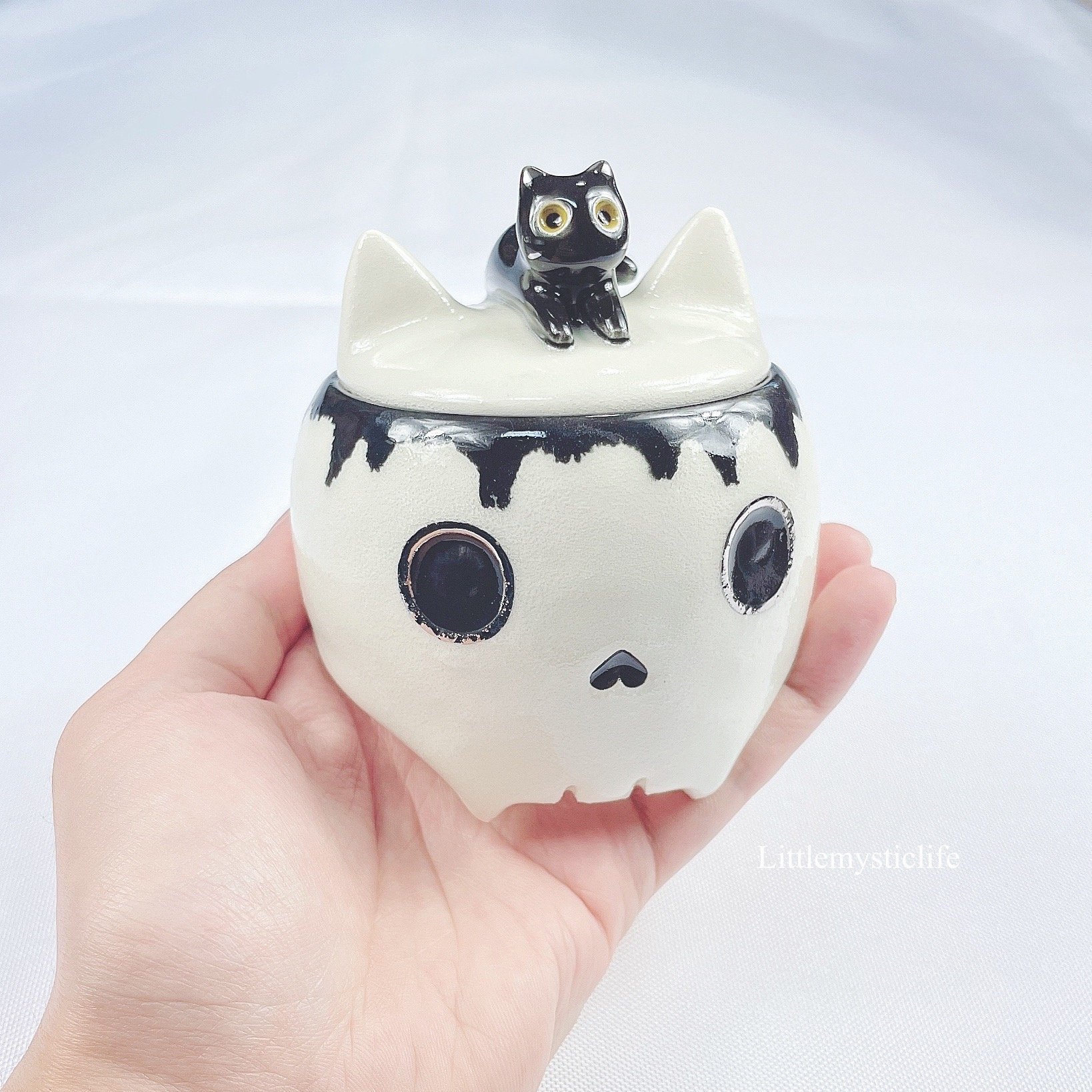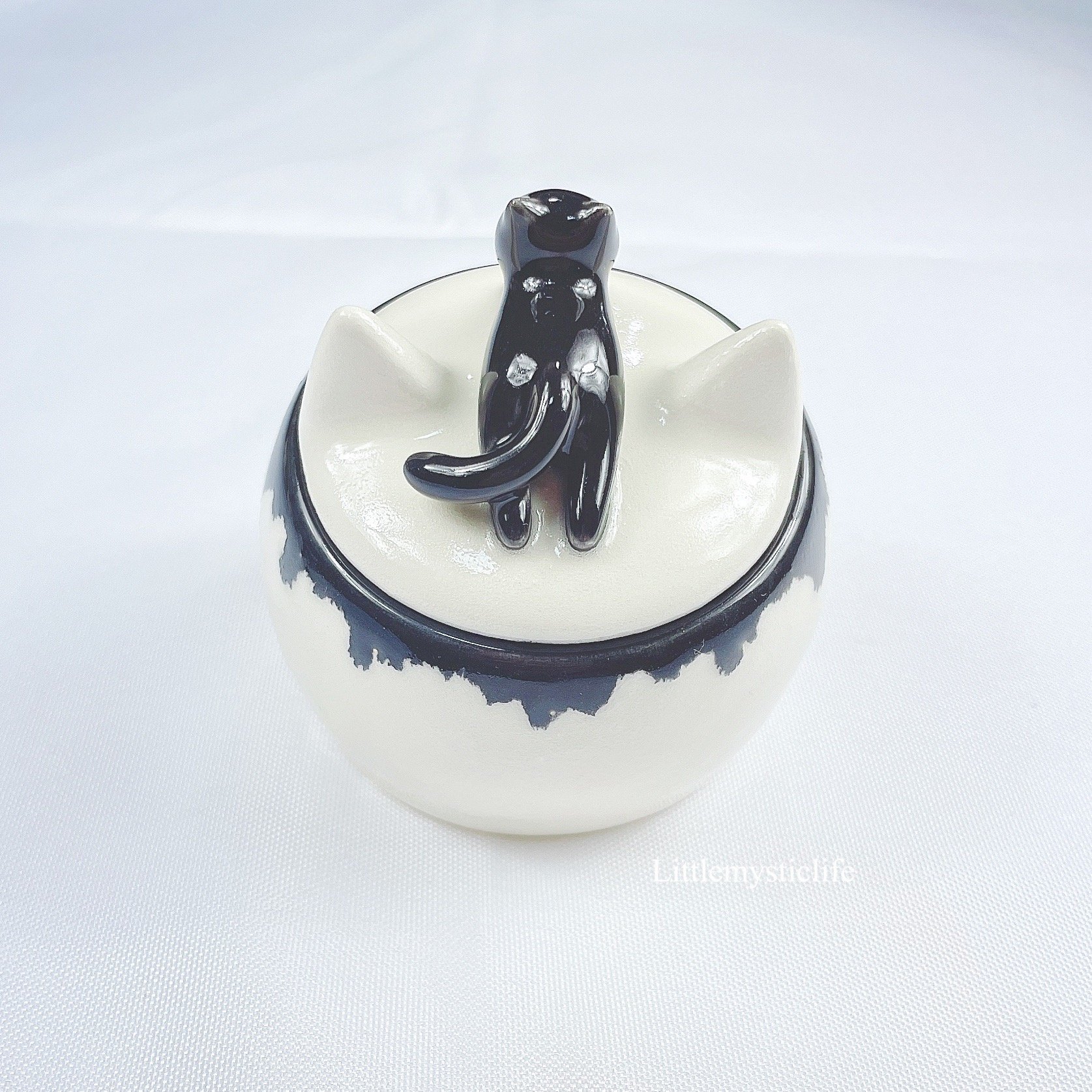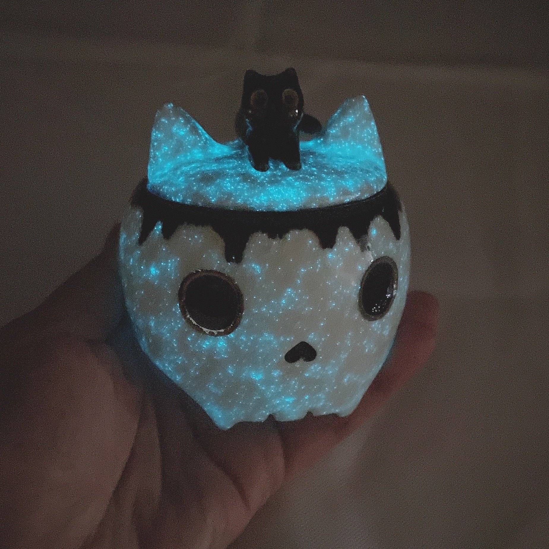 Mini kitten skull jewelry box is made of low fire earthen clay and glow in dark glaze for ceramic. This cat skull surface has bumpy texture naturally because of the glow in dark special mix glaze. Recharge glow in dark everyday under the sun for 50 mins or under UV lamp for 20 mins. Glow light can hold for 10-15 mins each recharge. In order to achieve the final looking pieces, I put a lot of time and care into sculpting, glazing, and firing my pieces at the right temperature. Delicate 22k white gold details are painted by hand in these pieces for elegant and shiny looking.