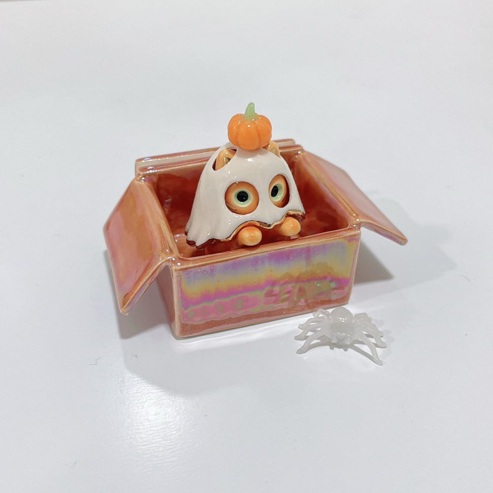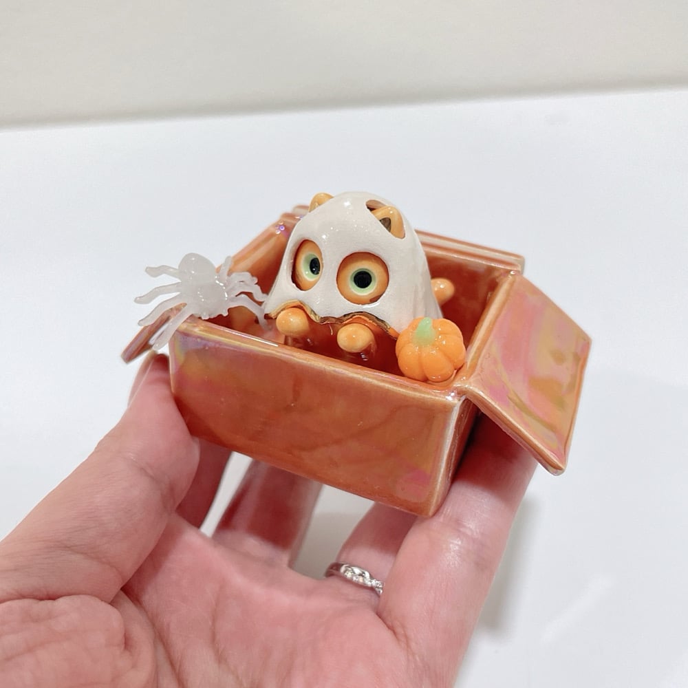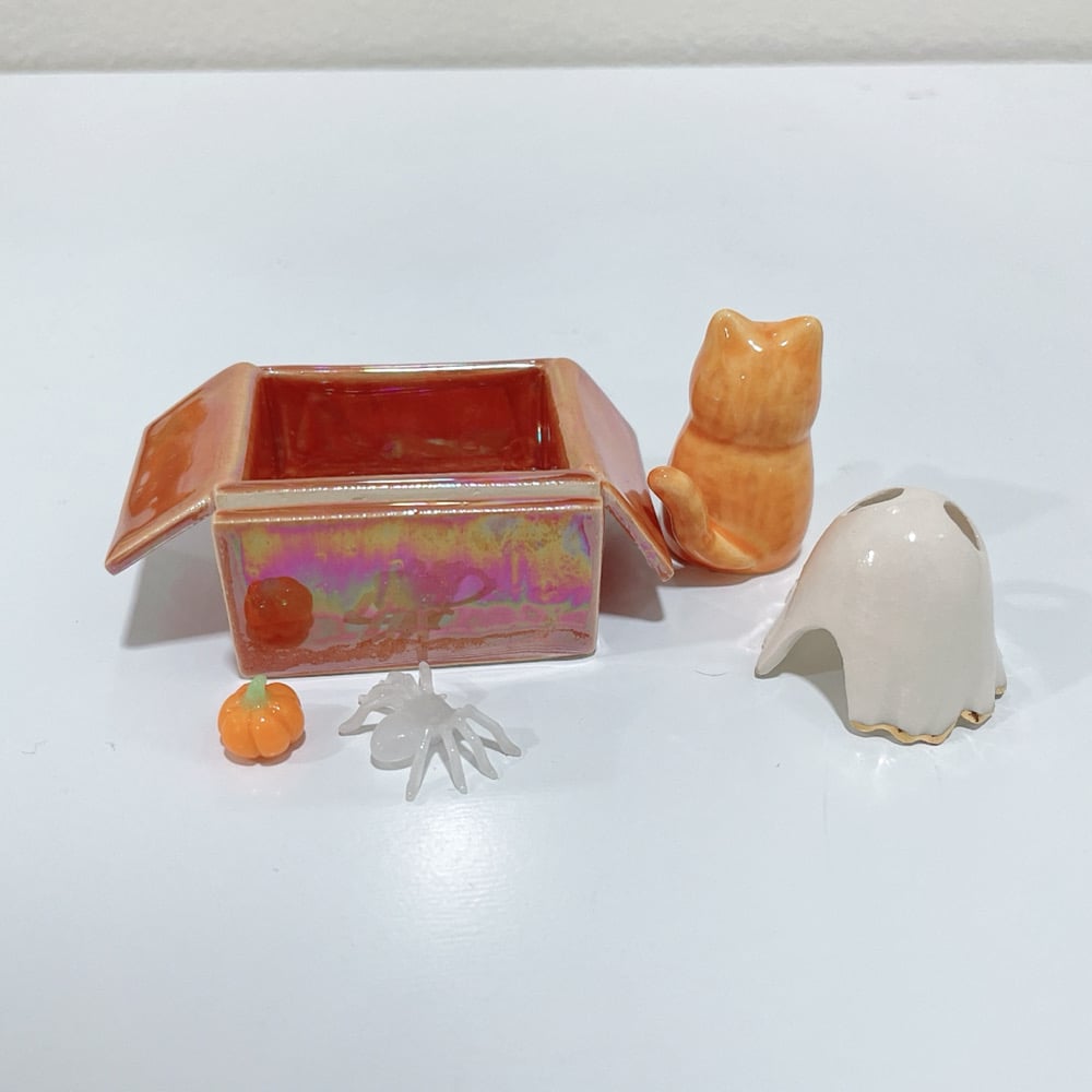 Glow in dark picture holder orange cat in the box ceramic keepsake is made of low fire earthen clay for ceramic. The picture I use here is a polaroid but you can use any type of pictures. The cat ghost mask has naturally bumpy texture from special glow in dark glaze. Magnetic and glow in dark feature for the pumpkin and spider. In order to achieve the final looking pieces, I put a lot of time and care into sculpting, glazing, and firing my pieces at the right temperature. Delicate 22k gold details are painted by hand in these pieces for elegant and shiny looking. The box has rainbow effect!