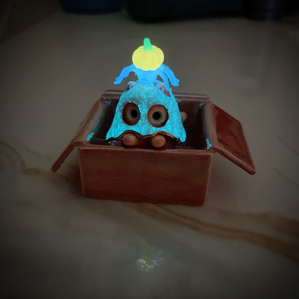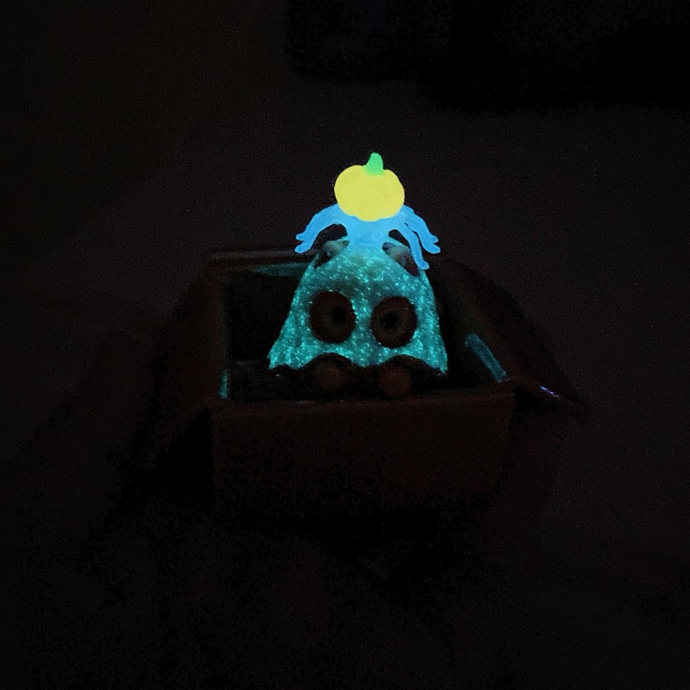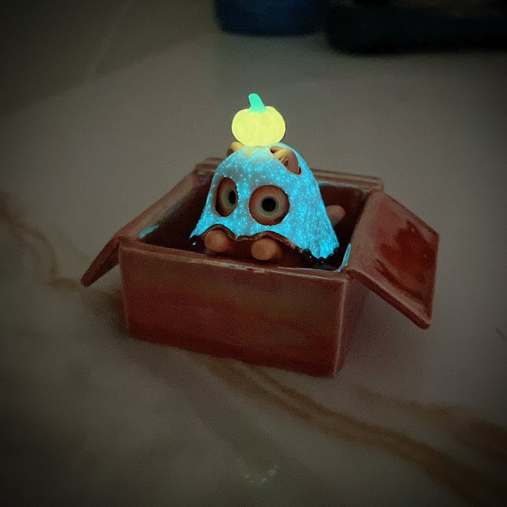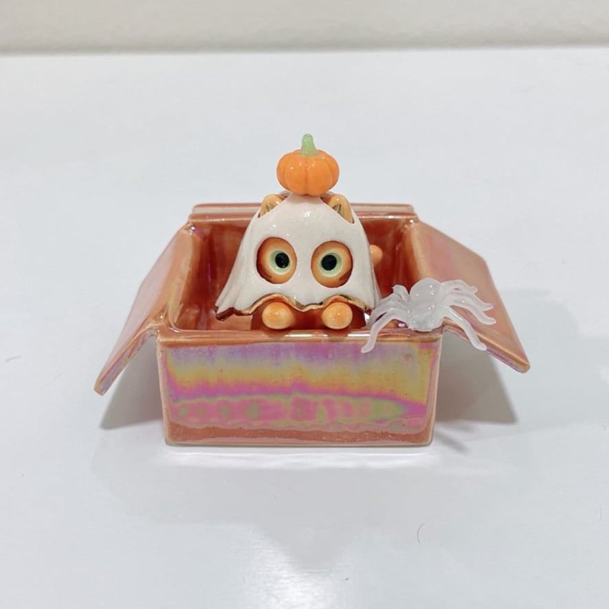 Glow in dark picture holder orange cat in the box ceramic keepsake is made of low fire earthen clay for ceramic. The picture I use here is a polaroid but you can use any type of pictures. The cat ghost mask has naturally bumpy texture from special glow in dark glaze. Magnetic and glow in dark feature for the pumpkin and spider. In order to achieve the final looking pieces, I put a lot of time and care into sculpting, glazing, and firing my pieces at the right temperature. Delicate 22k gold details are painted by hand in these pieces for elegant and shiny looking. The box has rainbow effect!