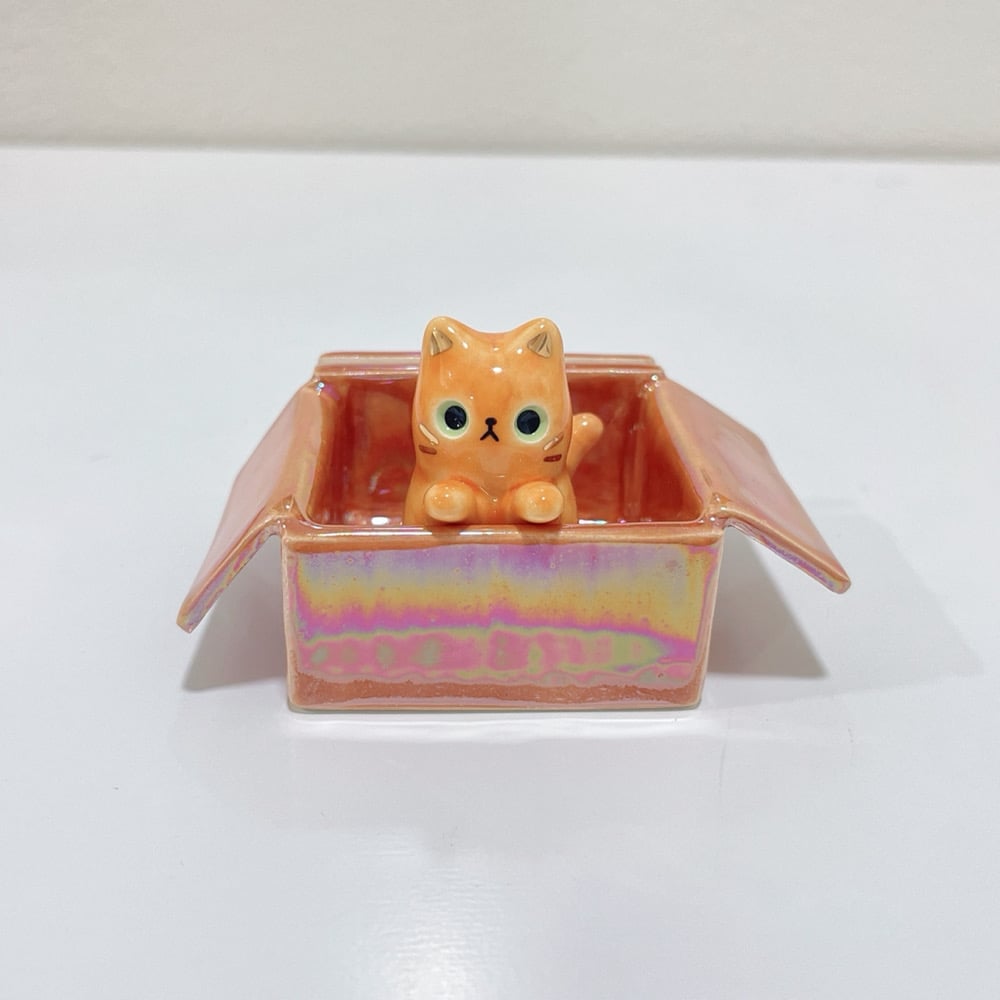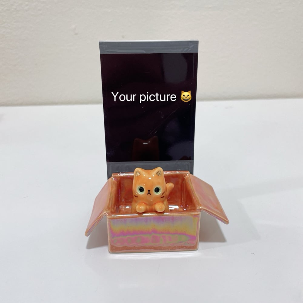 Glow in dark picture holder orange cat in the box ceramic keepsake (rainbow effect)