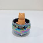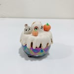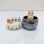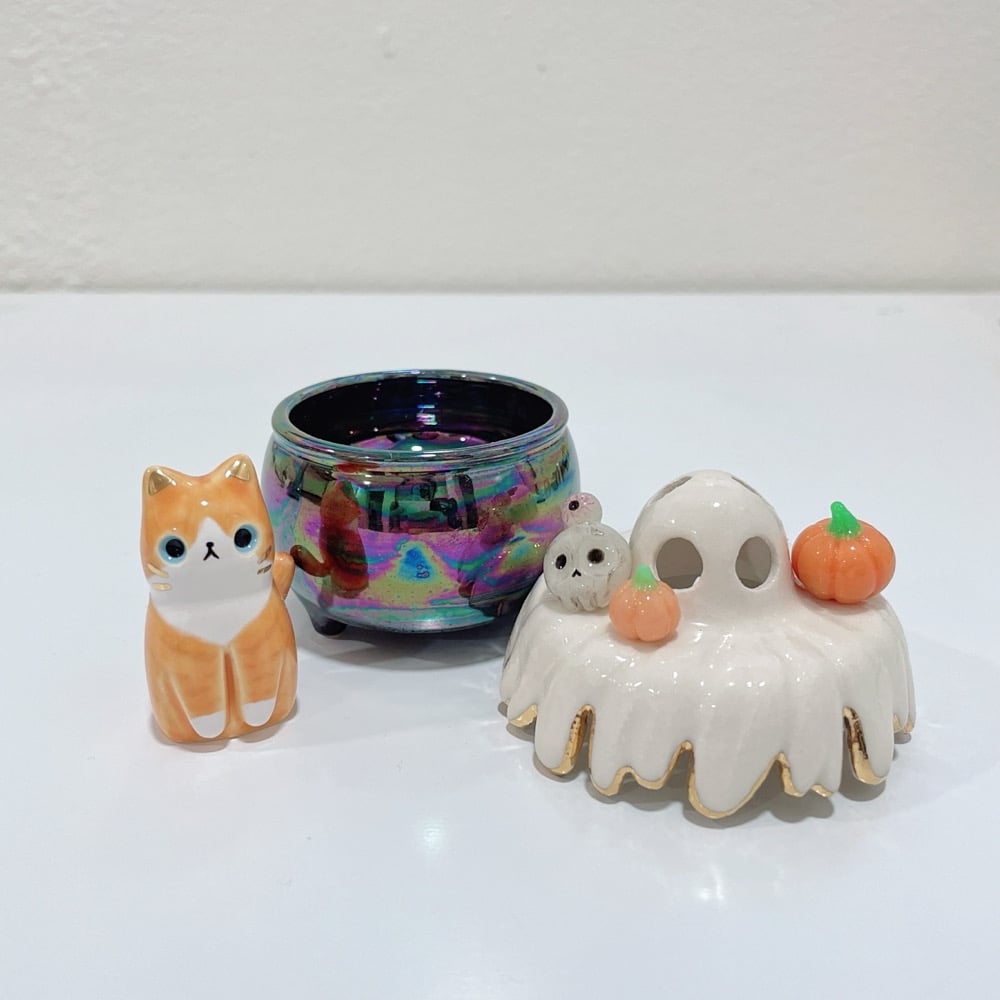 Glow in dark orange cat in witch brew cauldron ceramic keepsake is made of low fire earthen clay. The cat ghost mask has naturally bumpy texture from special glow in dark glaze. Magnetic and glow in dark feature for the pumpkins and skull. In order to achieve the final looking pieces, I put a lot of time and care into sculpting, glazing, and firing my pieces at the right temperature. Delicate 22k gold details are painted by hand in these pieces for elegant and shiny looking. The cauldron has rainbow effect!