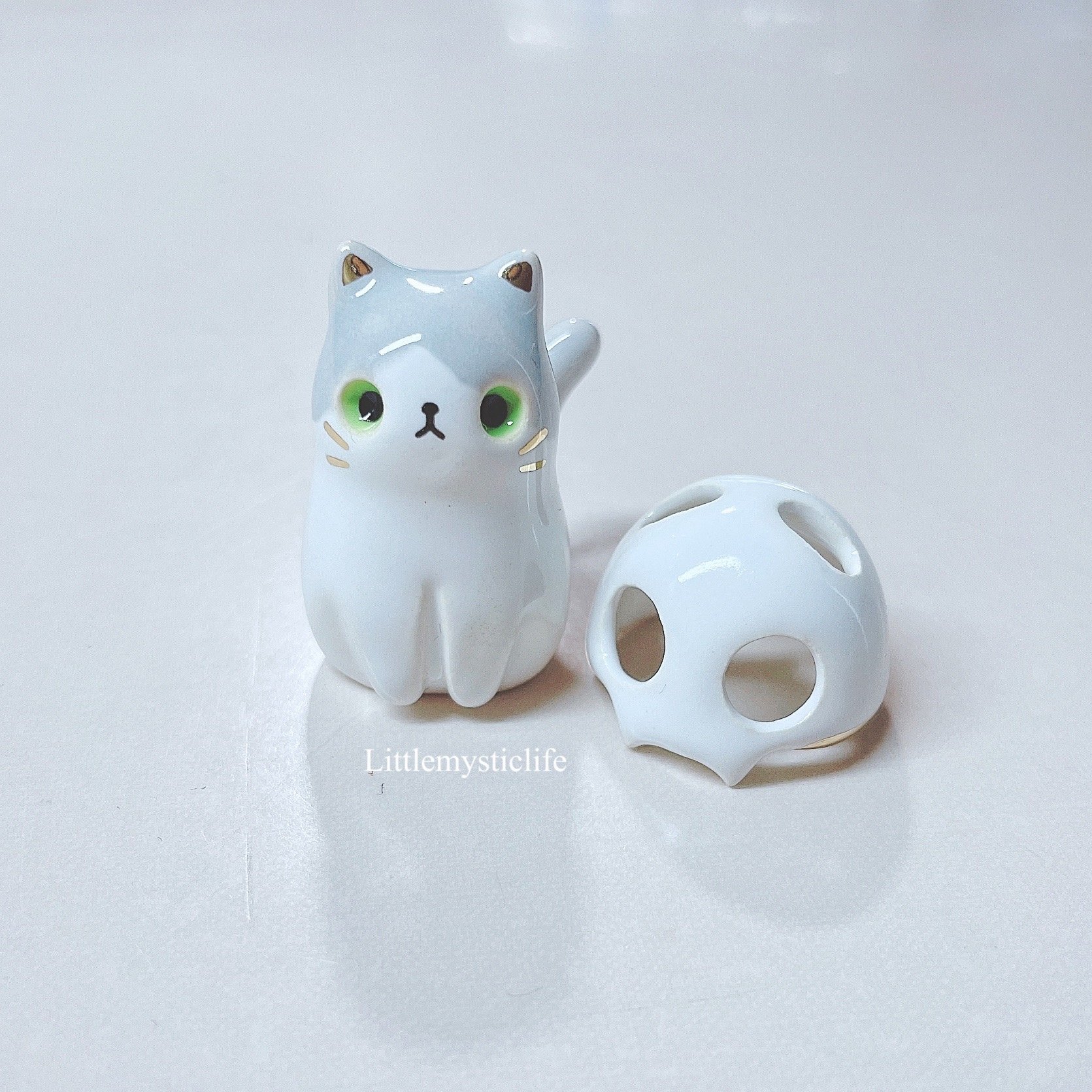 Gray and white kitty with skull mask ceramic figurine is made of low fire earthen clay and Duncan underglaze for ceramic. In order to achieve the final looking pieces, I put a lot of time and care into sculpting, glazing, and firing my pieces at the right temperature. Delicate 22k gold details are painted by hand in these pieces for elegant and shiny looking. Please handle them with care.