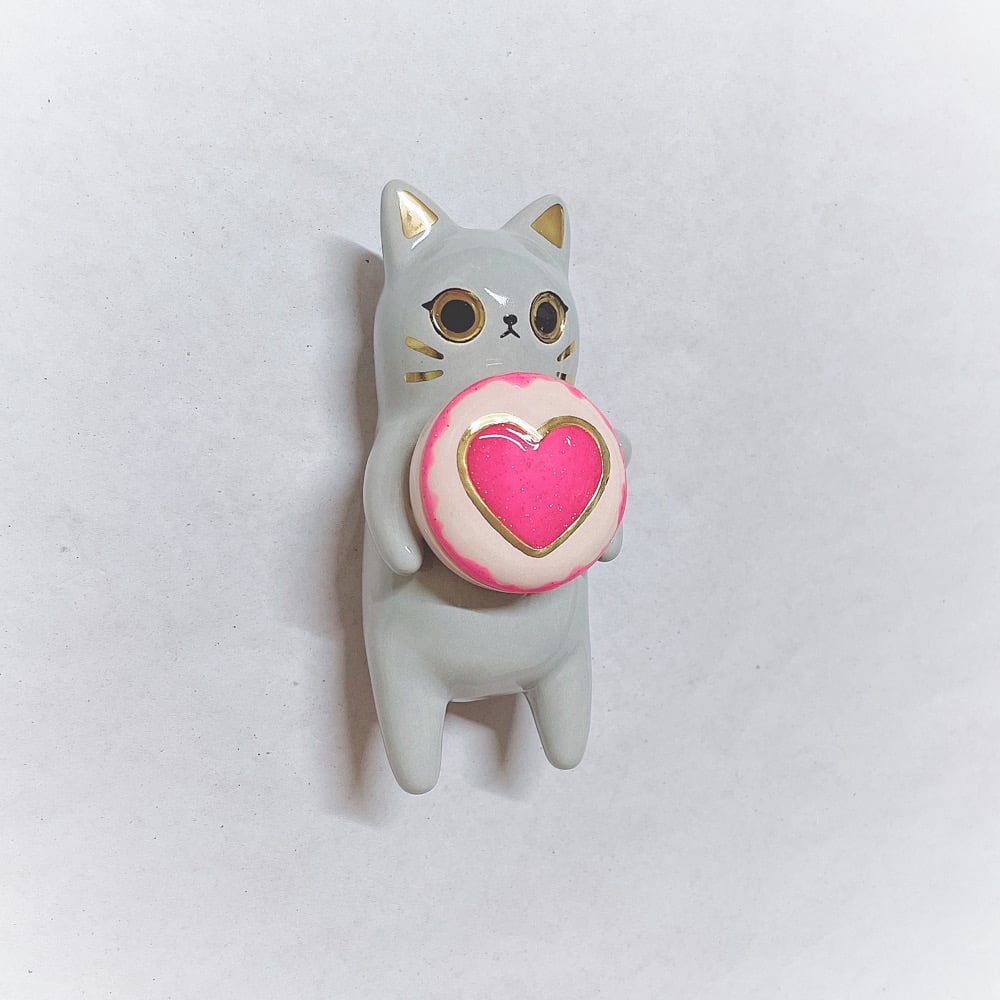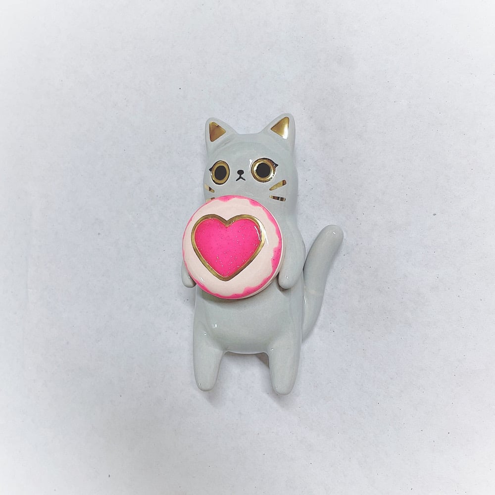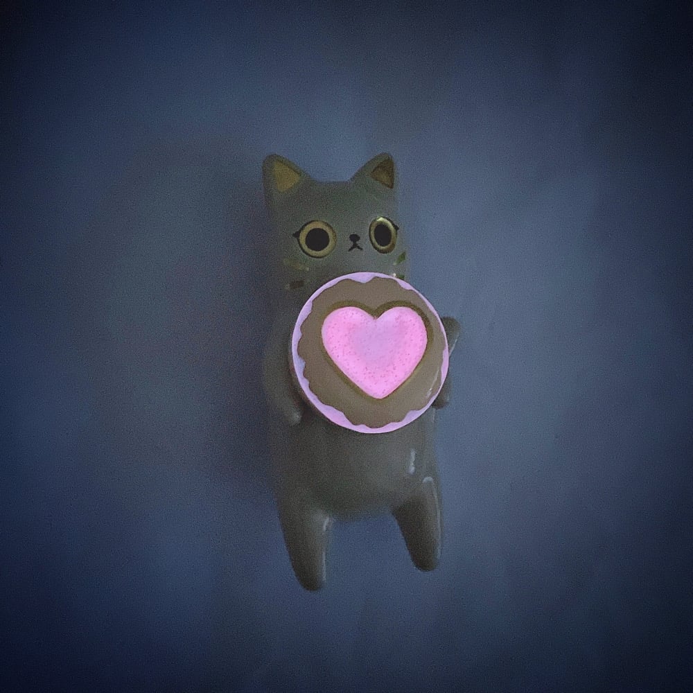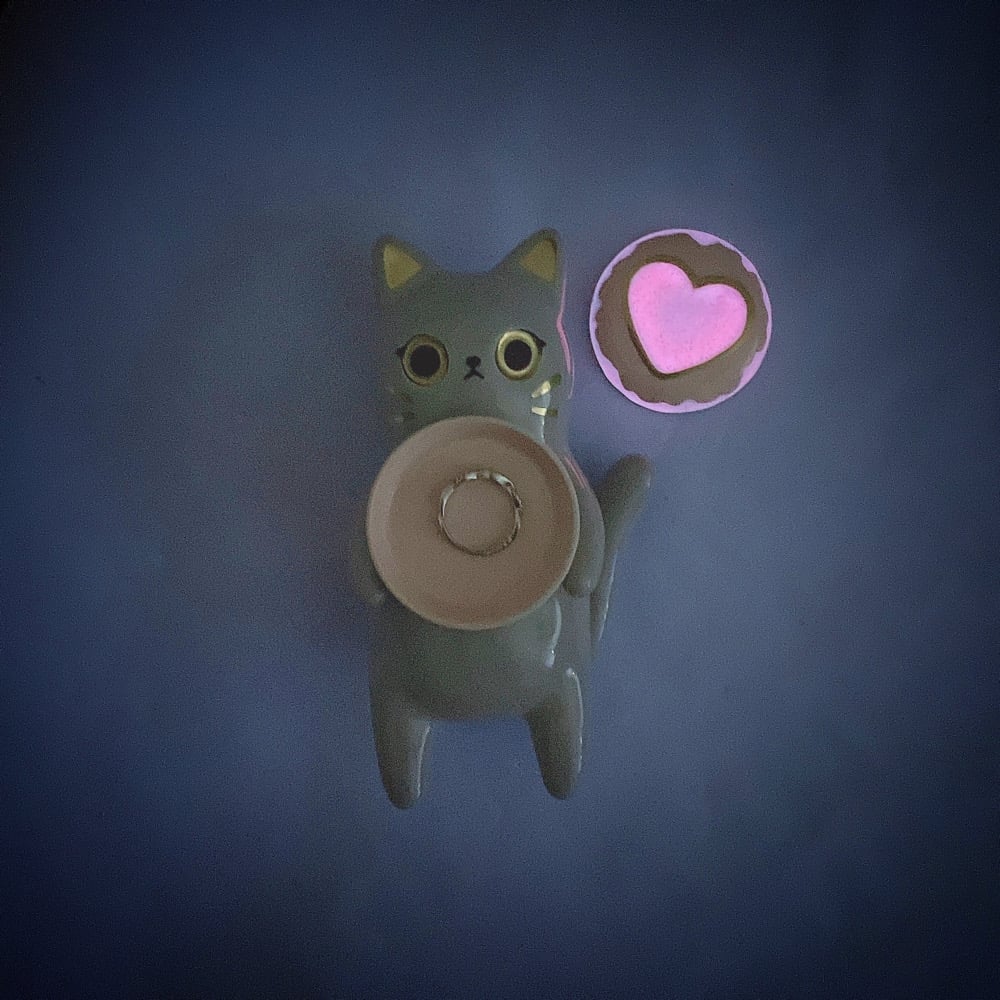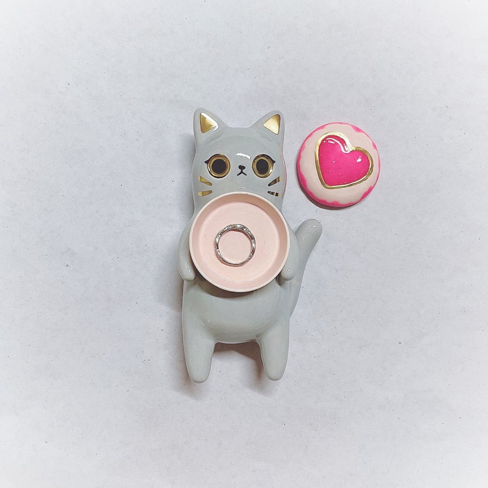 Gray cat holding glow in dark ring box hand size ceramic figurine is made of low fire earthen clay and Duncan underglaze for ceramic. Recharge glow light everyday under the sun for 40 mins or under UV light for 10 mins. Glow light can hold 15-20 mins each recharge. In order to achieve the final looking pieces, I put a lot of time and care into sculpting, glazing, and firing my pieces at the right temperature. Delicate 22k gold details are painted by hand in these pieces for elegant and shiny looking. Please handle them with care.