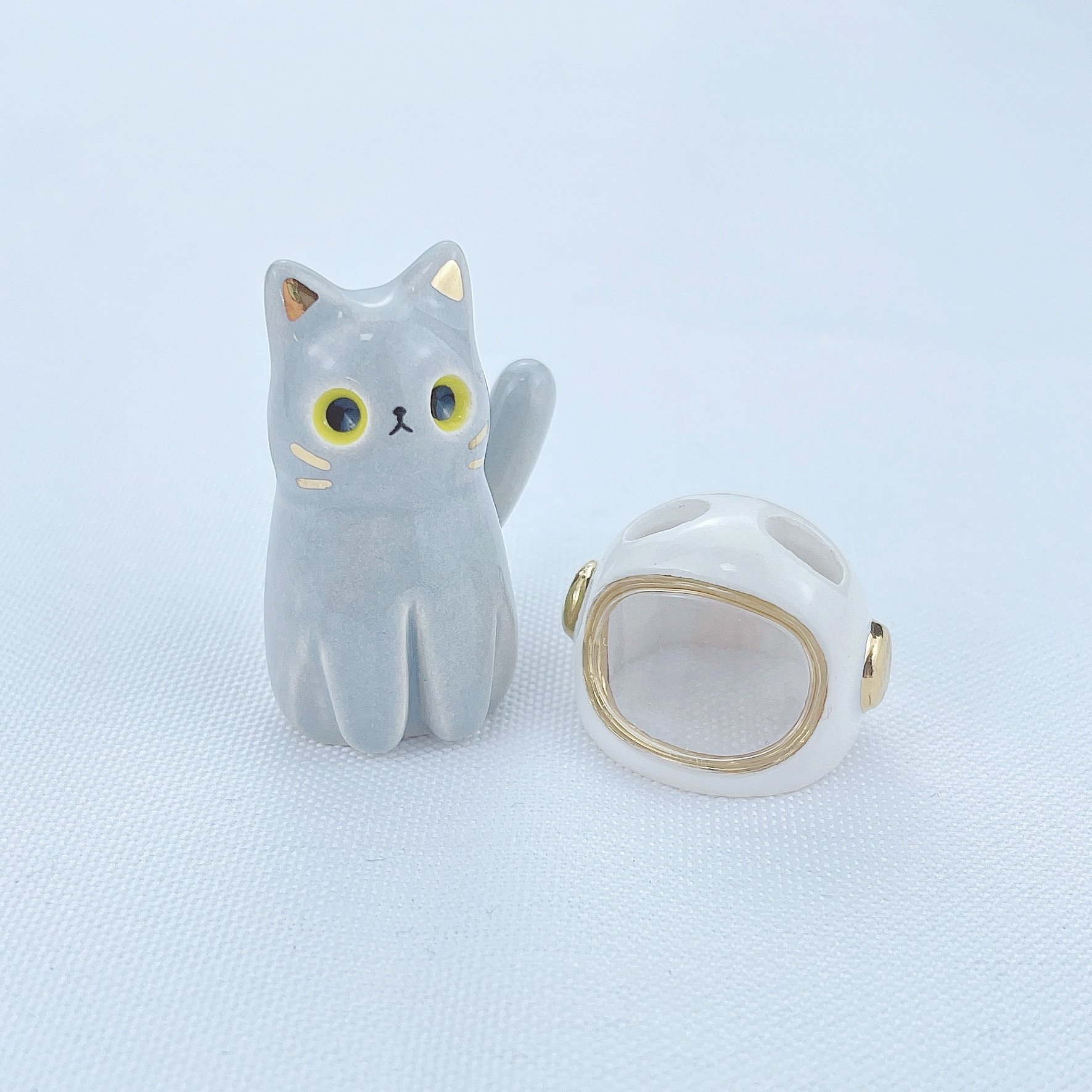 Gray cat with astronaut helmet ceramic figurine is made of low fire earthen clay and Duncan underglaze for ceramic. In order to achieve the final looking pieces, I put a lot of time and care into sculpting, glazing, and firing my pieces at the right temperature. Delicate 22k gold details are painted by hand in these pieces for elegant and shiny looking. Please handle them with care.