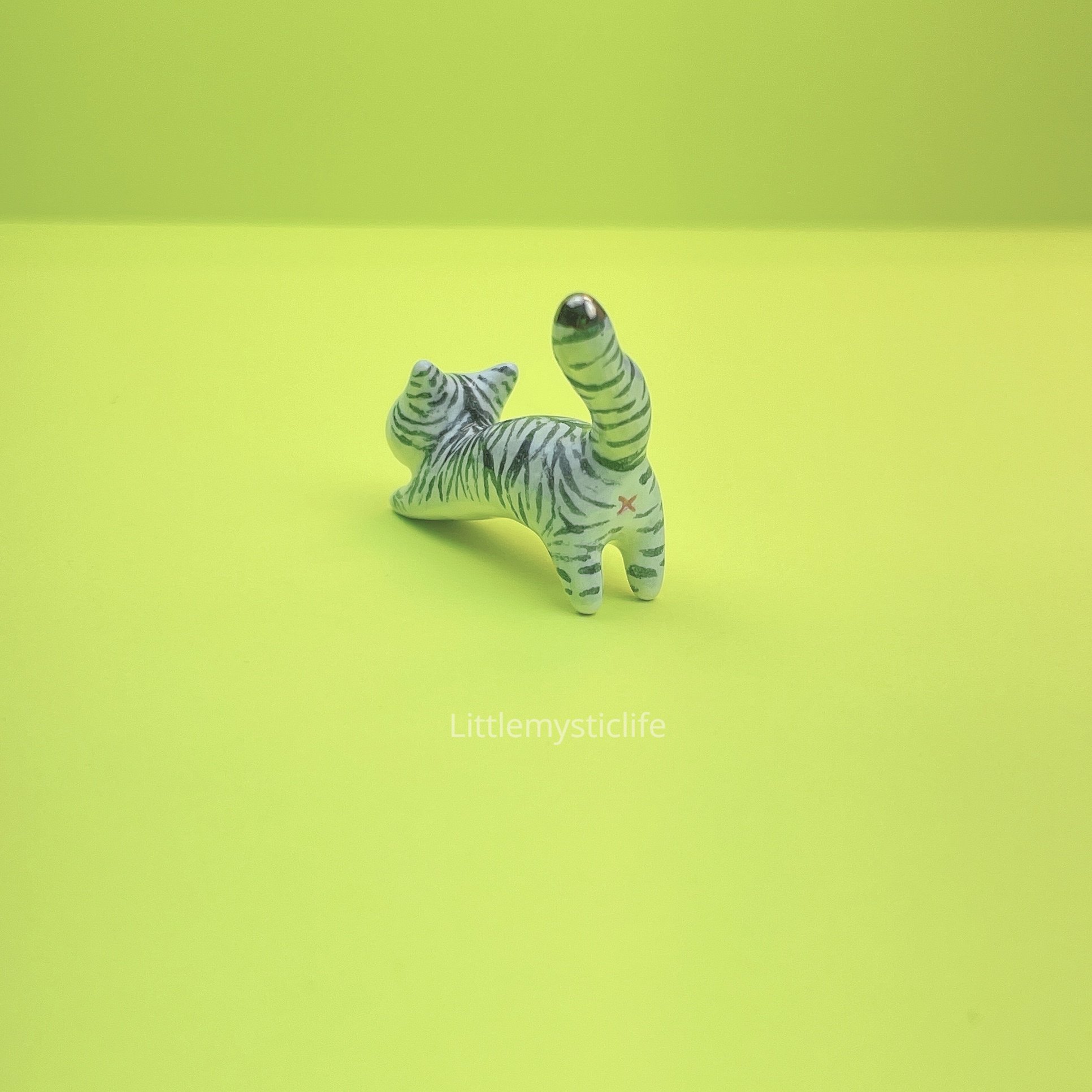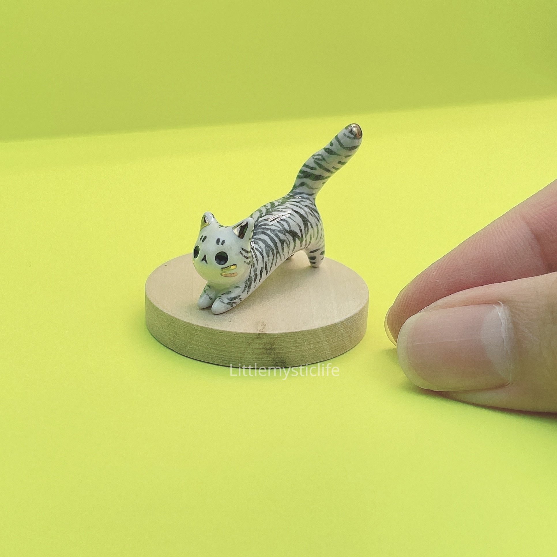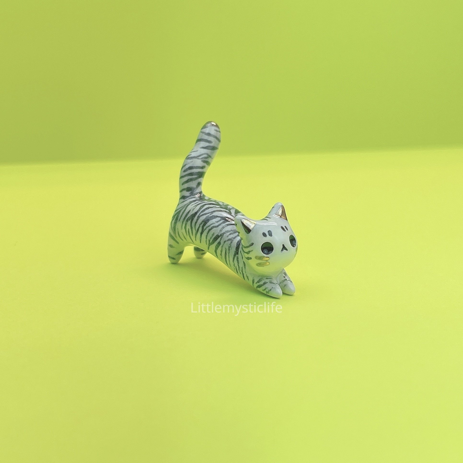 Gray tabby cat ceramic figurine is made of low fire earthen clay and Duncan underglaze for ceramic. In order to achieve the final looking pieces, I put a lot of time and care into sculpting, glazing, and firing my pieces at the right temperature. Delicate 22k gold details are painted by hand in these pieces for elegant and shiny looking. All my pieces are very small (about as big as your thumb), please handle them with care.