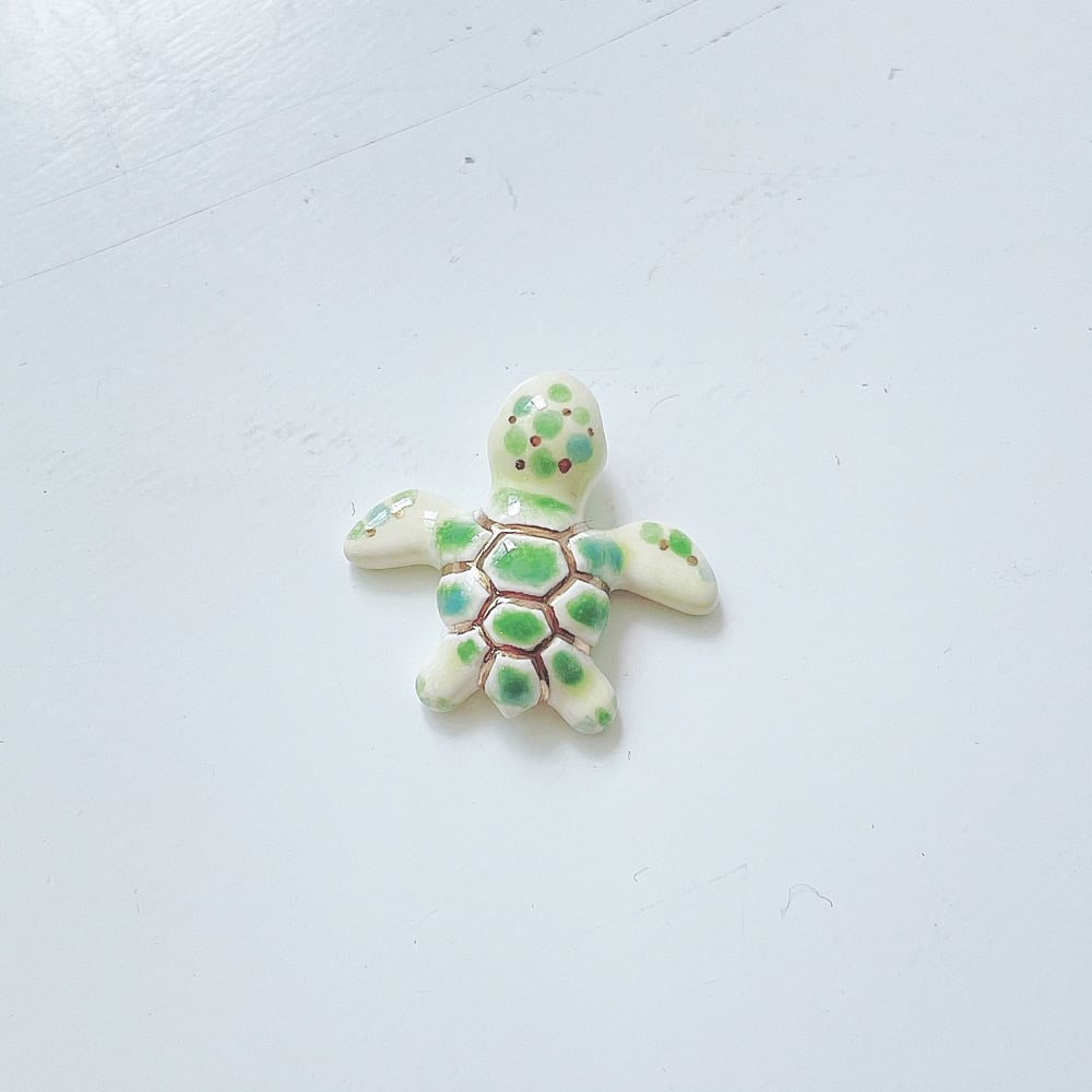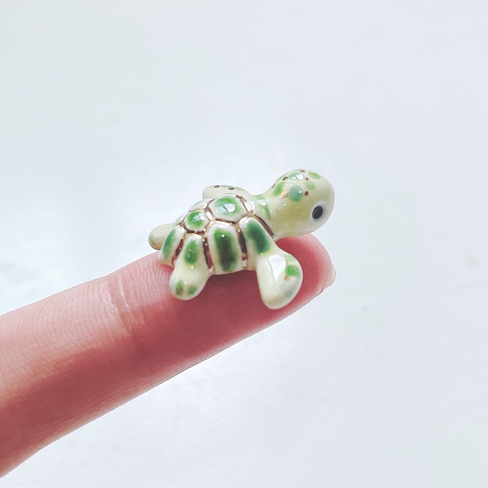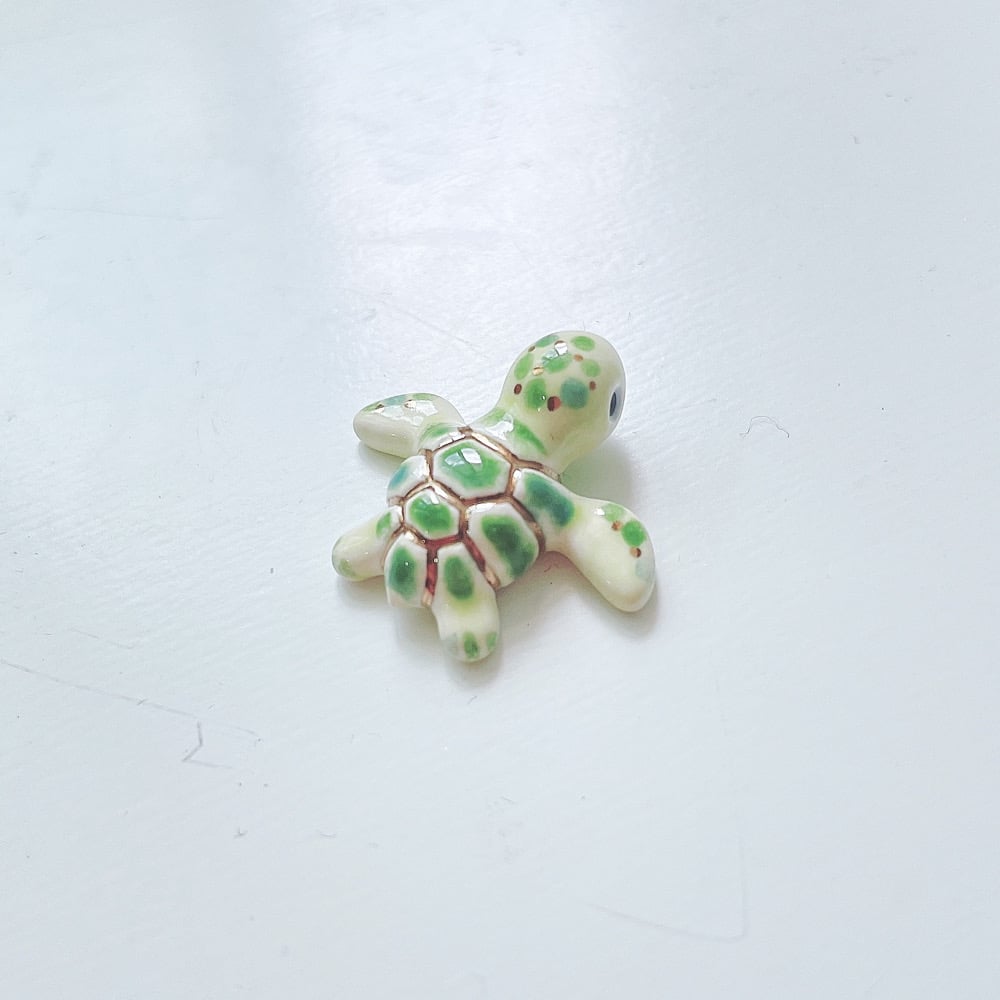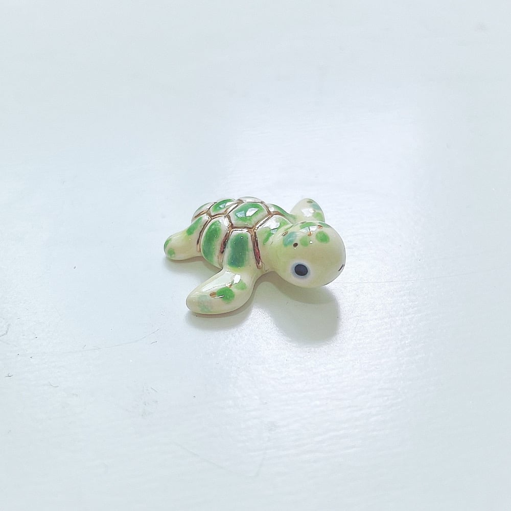 Turtle ceramic figurine is made of low fire earthen clay and Duncan underglaze for ceramic. In order to achieve the final looking pieces, I put a lot of time and care into sculpting, glazing, and firing my pieces at the right temperature. Delicate 22k gold details are painted by hand in these pieces for elegant and shiny looking. My pieces are very small (about as big as your thumb), please handle them with care.