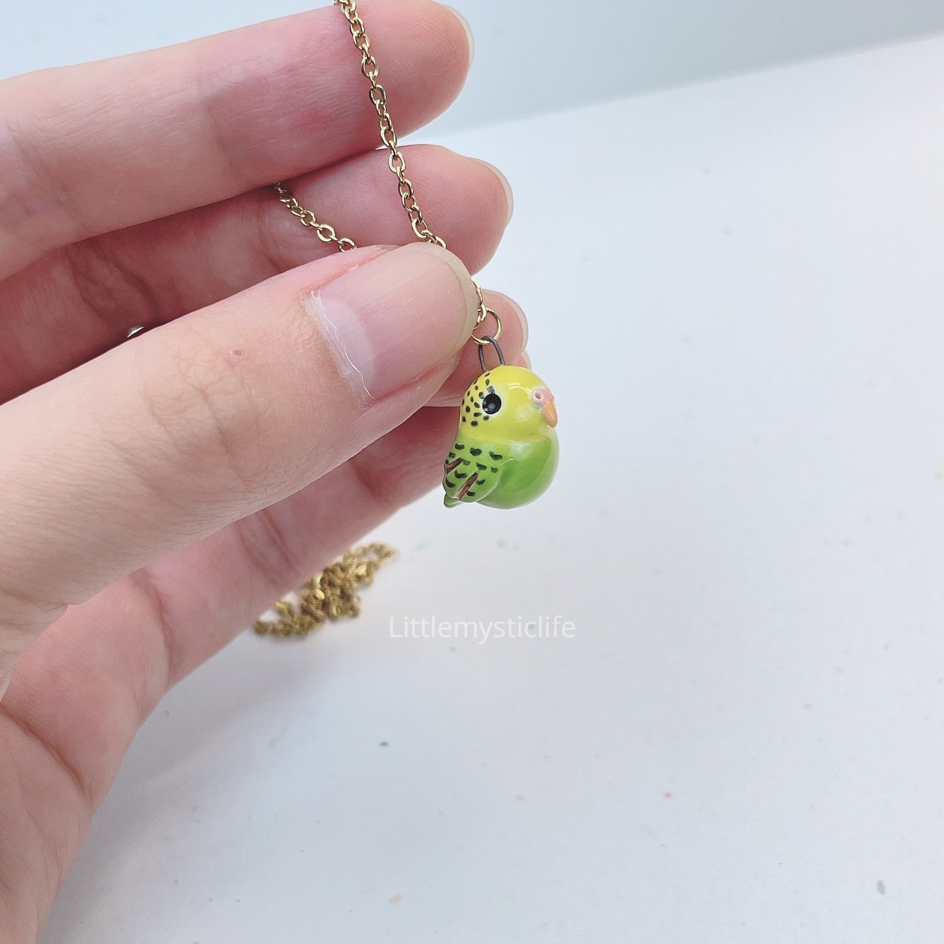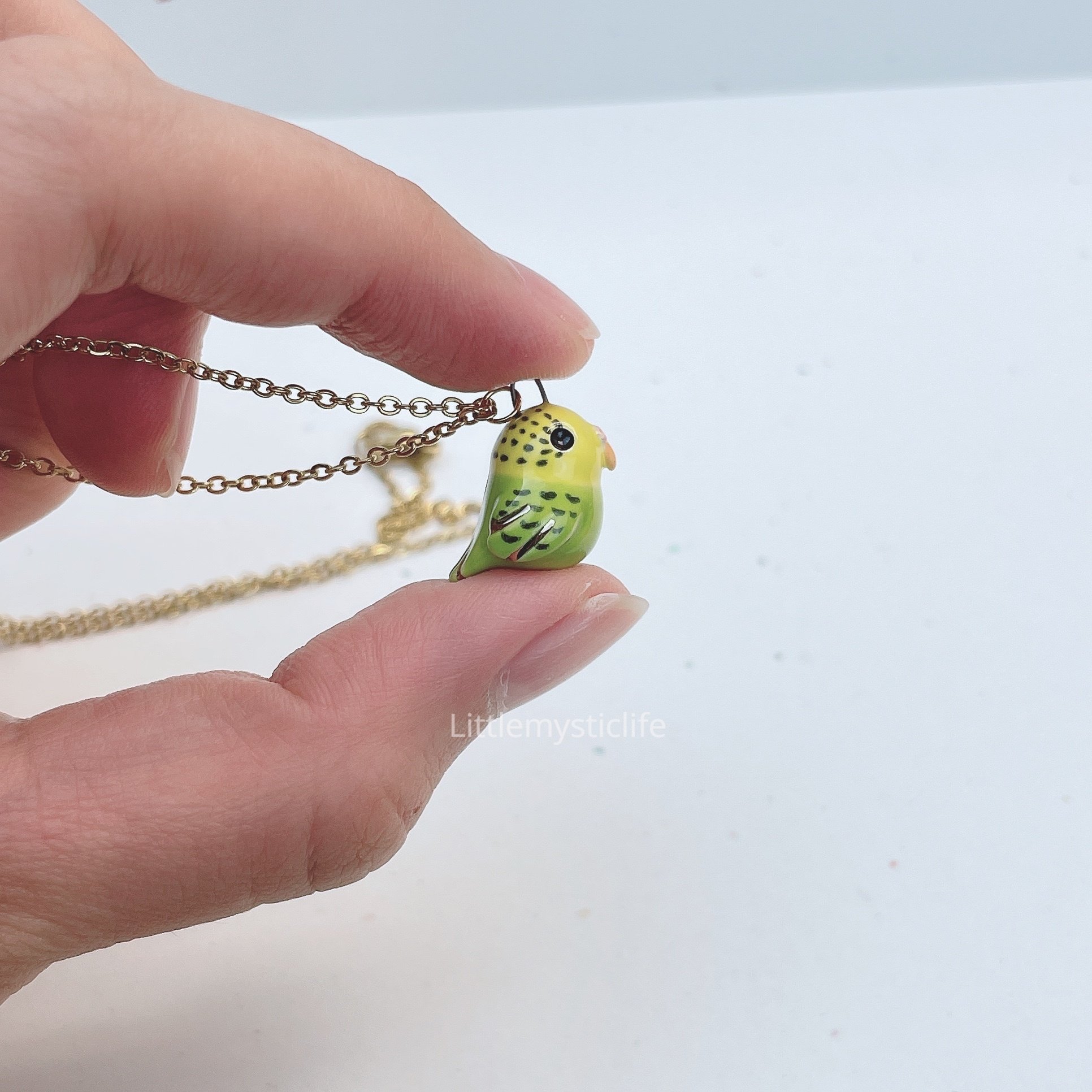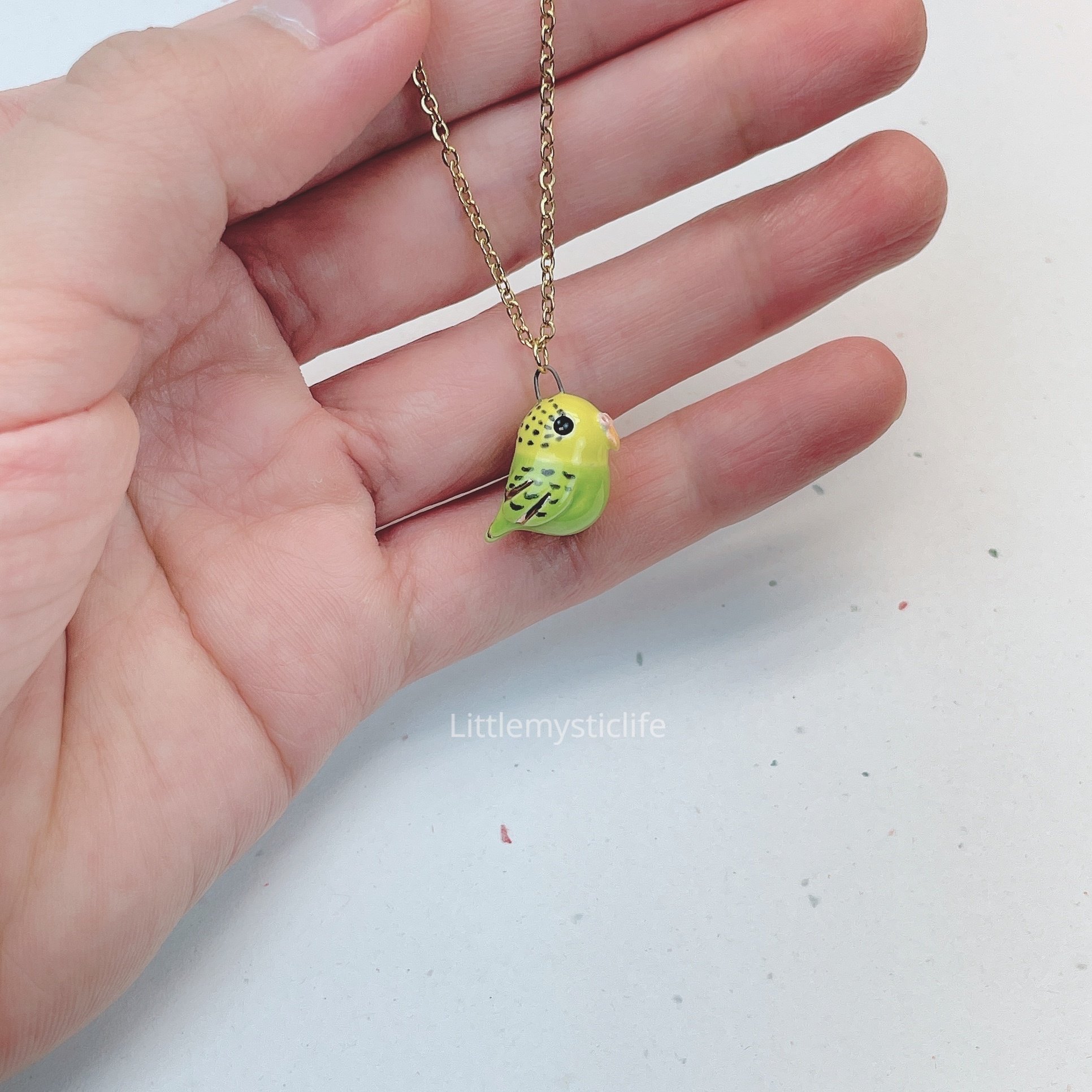 _Budgie ceramic necklace is made of low fire earthen clay and Duncan underglaze for ceramic. In order to achieve the final looking pieces, I put a lot of time and care into sculpting, glazing, and firing my pieces at the right temperature. Delicate 22k gold details are painted by hand in these pieces for elegant and shiny looking. All my pieces are very small (about as big as your thumb), please handle them with care and I recommend to take off your necklace while sleeping and showering.