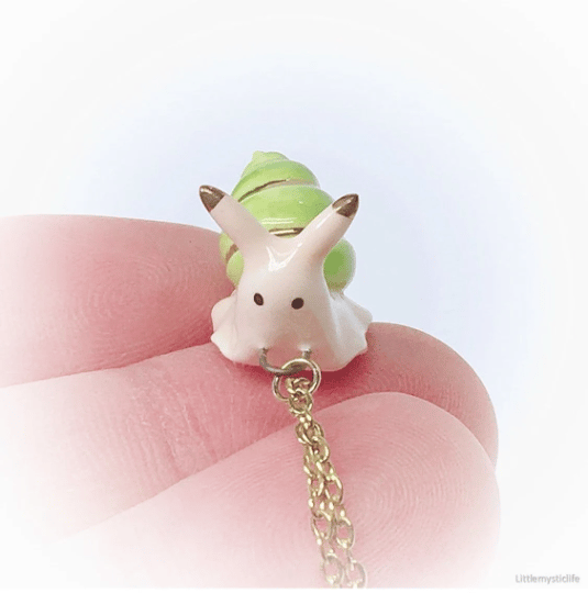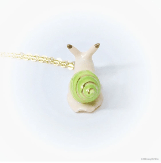 _Snail ceramic necklace is made of low fire earthen clay and Duncan underglaze for ceramic. In order to achieve the final looking pieces, I put a lot of time and care into sculpting, glazing, and firing my pieces at the right temperature. Delicate 22k gold details are painted by hand in these pieces for elegant and shiny looking. All my pieces are very small (about as big as your thumb), please handle them with care and I recommend to take off your necklace while sleeping and showering.