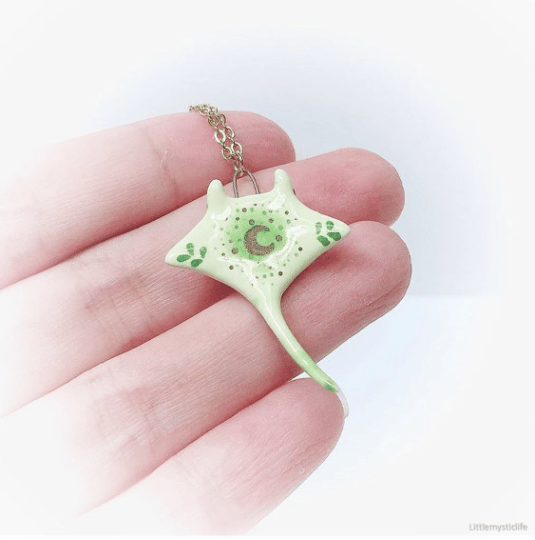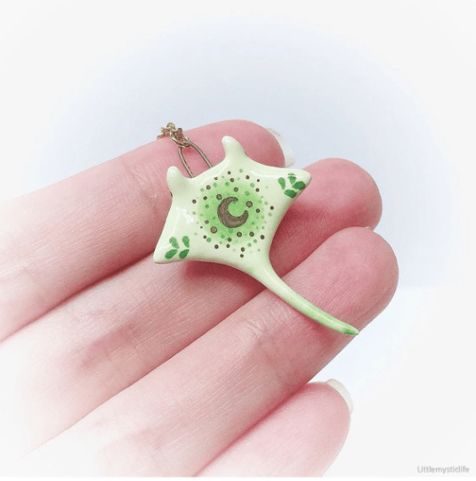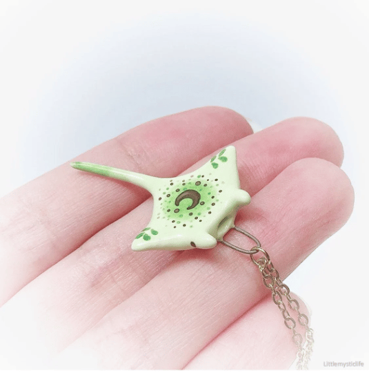 _Stingray ceramic necklace is made of low fire earthen clay and Duncan underglaze for ceramic. In order to achieve the final looking pieces, I put a lot of time and care into sculpting, glazing, and firing my pieces at the right temperature. Delicate 22k gold details are painted by hand in these pieces for elegant and shiny looking. All my pieces are very small (about as big as your thumb), please handle them with care and I recommend to take off your necklace while sleeping and showering.