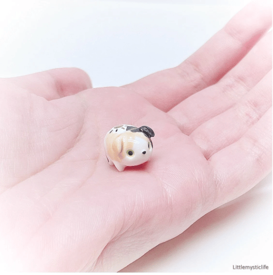 Guinea pig ceramic figurine is made of low fire earthen clay and Duncan underglaze for ceramic. In order to achieve the final looking pieces, I put a lot of time and care into sculpting, glazing, and firing my pieces at the right temperature. Delicate 22k gold details are painted by hand in these pieces for elegant and shiny looking. All my pieces are very small (about as big as your thumb), please handle them with care.