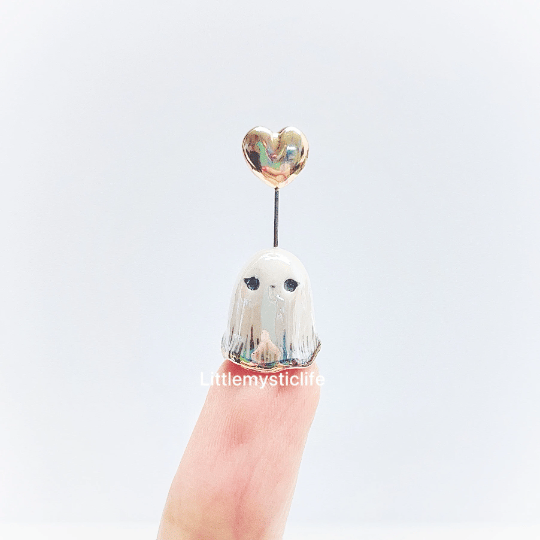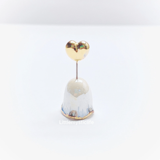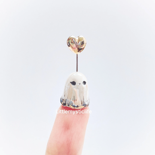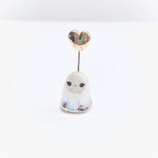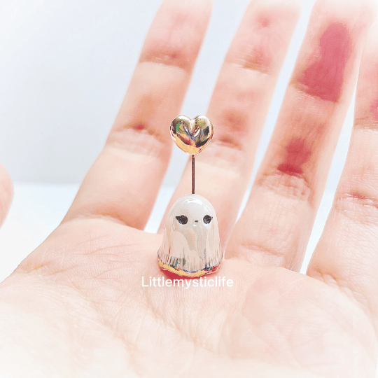 heart ghost ceramic figurine is made of low fire earthen clay and Duncan underglaze for ceramic. In order to achieve the final looking pieces, I put a lot of time and care into sculpting, glazing, and firing my pieces at the right temperature. Delicate 22k gold details are painted by hand in these pieces for elegant and shiny looking. All my pieces are very small (about as big as your thumb), please handle them with care.