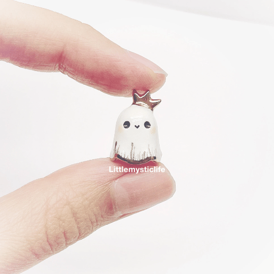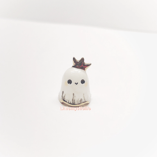 King ghost ceramic figurine is made of low fire earthen clay and Duncan underglaze for ceramic. In order to achieve the final looking pieces, I put a lot of time and care into sculpting, glazing, and firing my pieces at the right temperature. Delicate 22k gold details are painted by hand in these pieces for elegant and shiny looking. All my pieces are very small (about as big as your thumb), please handle them with care.