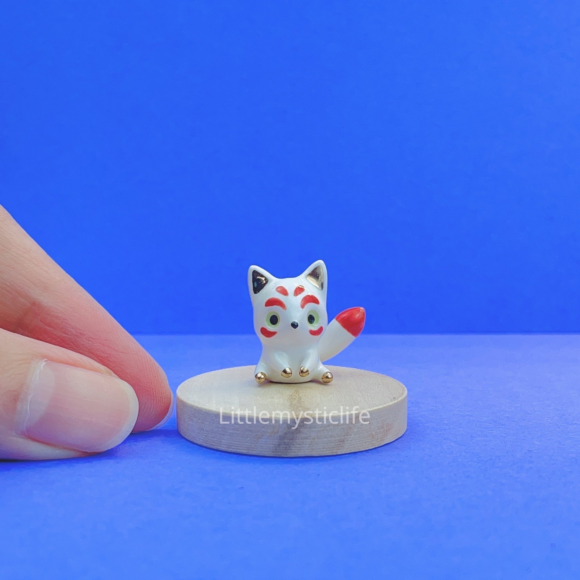 Kitsune fox ceramic figurine is made of low fire earthen clay and Duncan underglaze for ceramic. In order to achieve the final looking pieces, I put a lot of time and care into sculpting, glazing, and firing my pieces at the right temperature. Delicate 22k gold details are painted by hand in these pieces for elegant and shiny looking. All my pieces are very small (about as big as your thumb), please handle them with care.