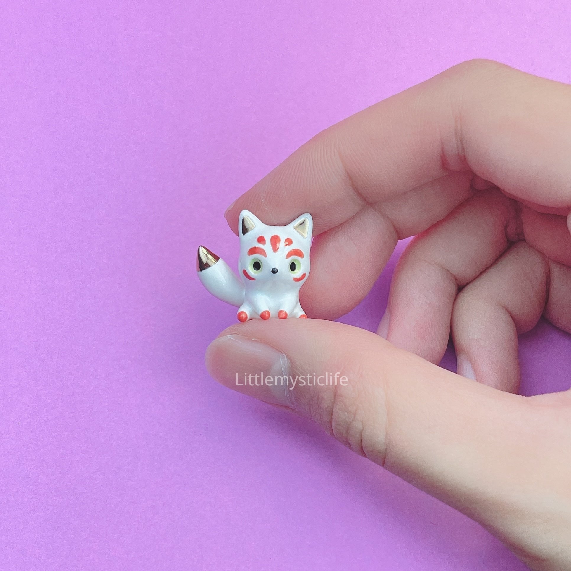 Kitsune fox ceramic figurine is made of low fire earthen clay and Duncan underglaze for ceramic. In order to achieve the final looking pieces, I put a lot of time and care into sculpting, glazing, and firing my pieces at the right temperature. Delicate 22k gold details are painted by hand in these pieces for elegant and shiny looking. All my pieces are very small (about as big as your thumb), please handle them with care.