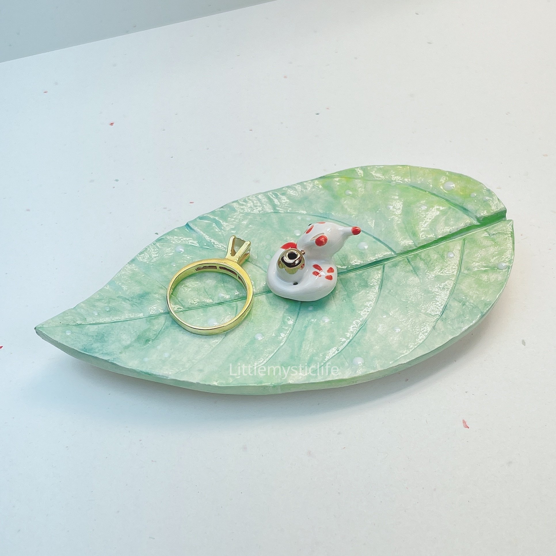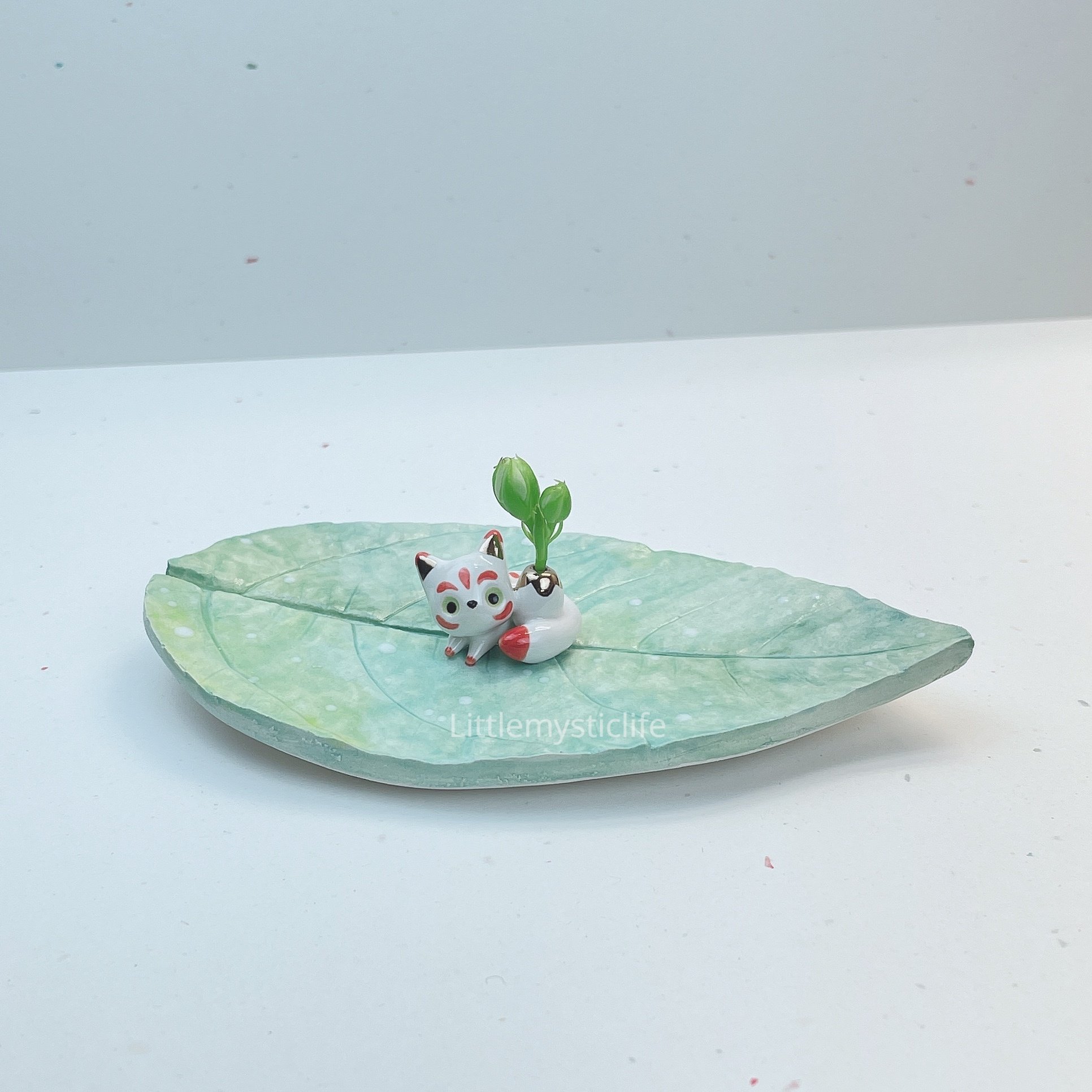 Kitsune fox leaf ring dish is made of low fire earthen clay and Duncan underglaze for ceramic. In order to achieve the final looking pieces, I put a lot of time and care into sculpting, glazing, and firing my pieces at the right temperature. Delicate 22k gold details are painted by hand in these pieces for elegant and shiny looking. All my pieces are very small (about as big as your thumb), please handle them with care.