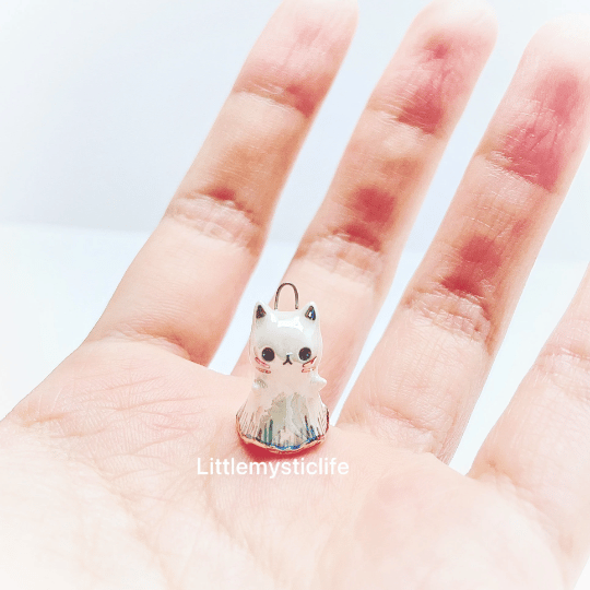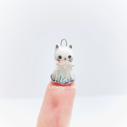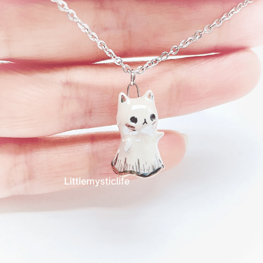 _Kitty ghost ceramic necklace is made of low fire earthen clay and Duncan underglaze for ceramic. In order to achieve the final looking pieces, I put a lot of time and care into sculpting, glazing, and firing my pieces at the right temperature. Delicate 22k gold details are painted by hand in these pieces for elegant and shiny looking. All my pieces are very small (about as big as your thumb), please handle them with care and I recommend to take off your necklace while sleeping and showering.